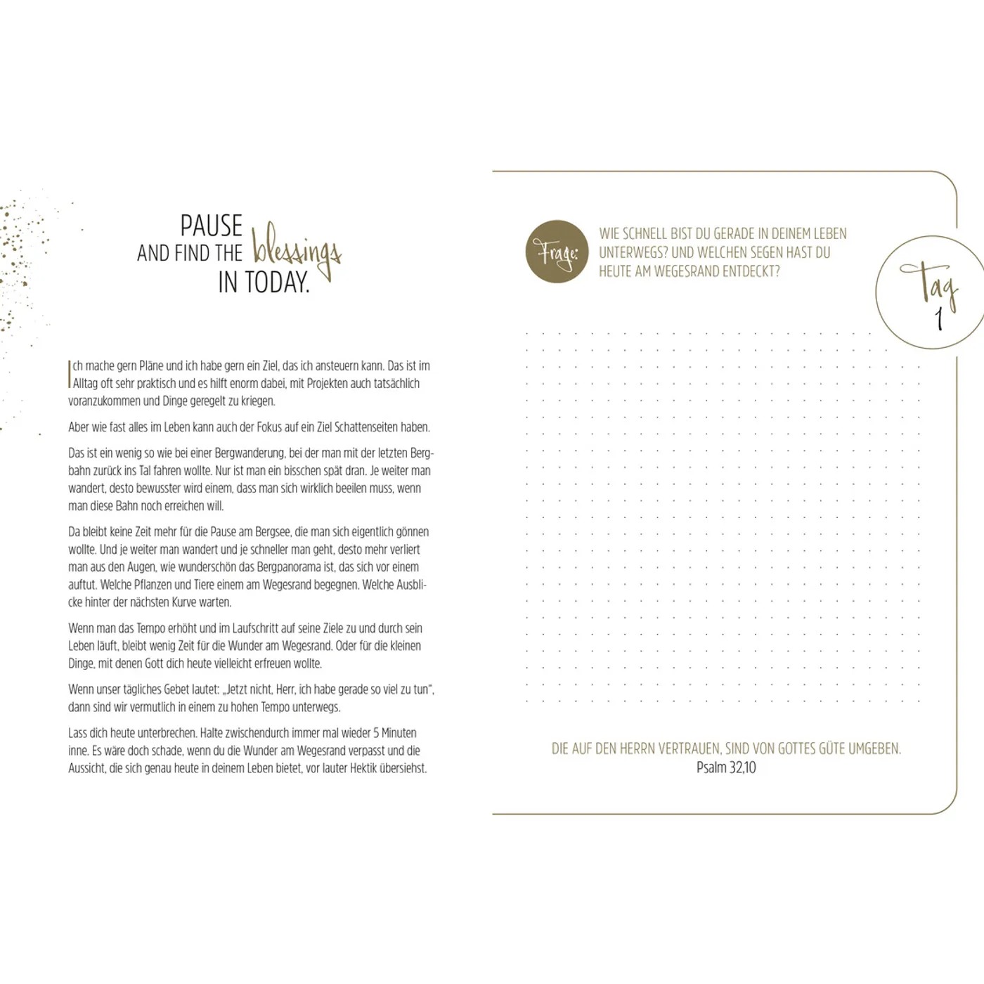 Auf jeder Doppelseite findet links entweder eine Andacht oder ein einprägsamer Spruch und rechts eine Reflexionsfrage mit Raum zum Antworten und einem Bibelvers am Ende.