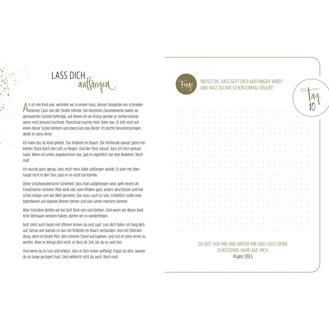Enthalten sind 72 Andachten; die restlichen Journal-Impulse haben statt eines Texts im typischen Look der Produktwelt ein ganzseitiges Motiv in Graustufen mit englischem Glaubensstatement in Goldschrift dabei.
