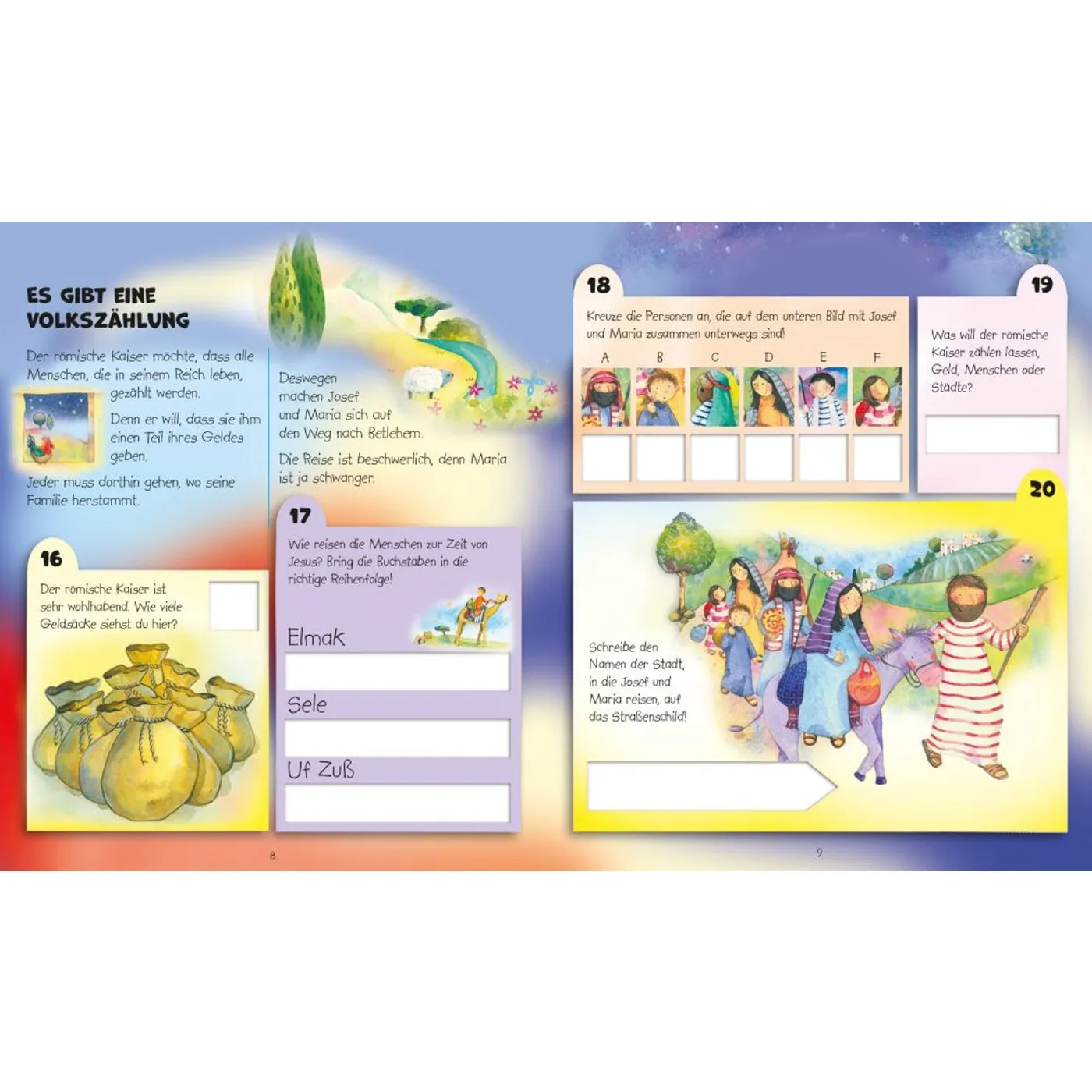 Zu vier der Themen gibt es eine zweite Doppelseite. Das betrifft zum Beispiel die Ankunft der Weisen aus dem Morgenland. Auf der befindet sich ein großes Bild mit einer einzigen Aufgabe, bei der es immer um das Zählen von Bildelementen geht.