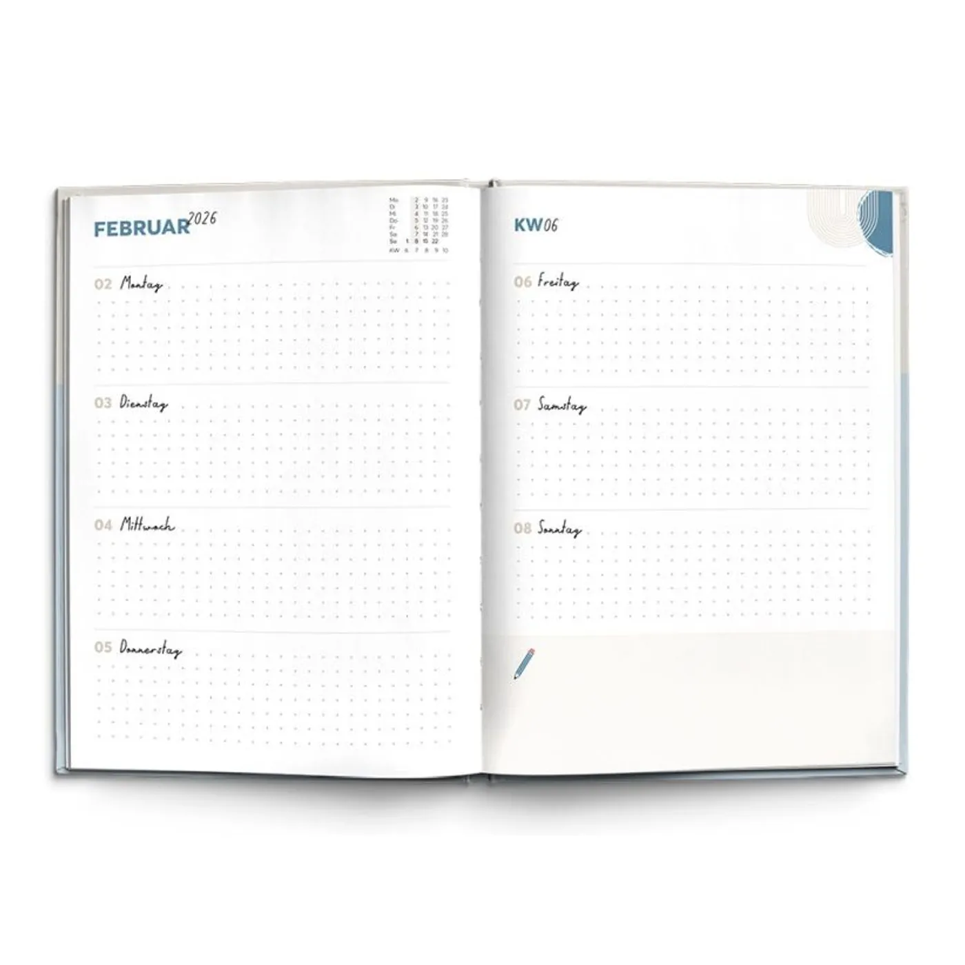 Der Kalender endet mit der ersten Januarwoche 2027. Daran schließen sich verschiedene Inhalte, wie Gebetsliste, Vorhaben und Ideen für 2026, Ideenglas, Wunsch- und Geschenkliste, Liste für Bücher, Filme und Serien und Notizen an.
