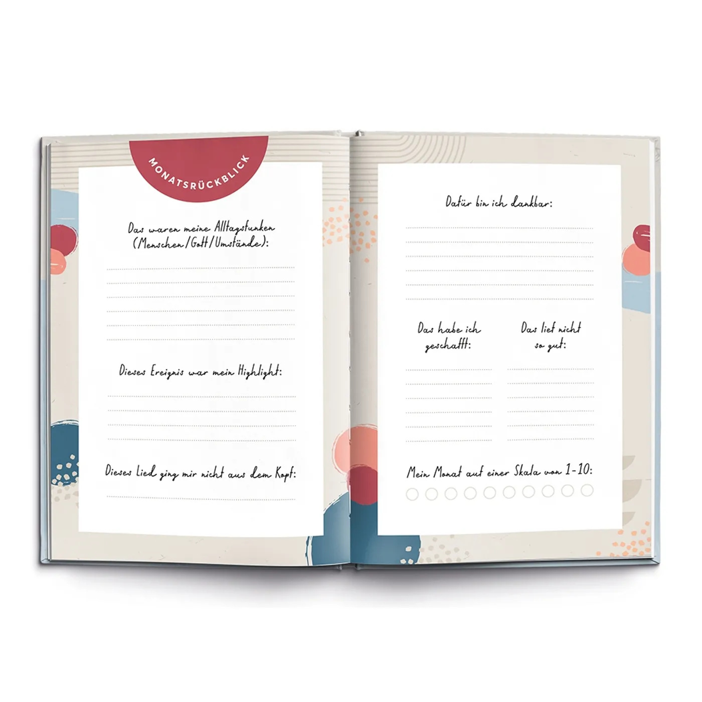 Jeder Monat beginnt mit einer eigenen Monatsübersicht und einem passenden Bibelvers. Anschließend folgt ein Gedanke verschiedener Autorinnen. Beendet wird der Monat mit einem Rückblick auf diesen und hier bietet sich Raum zum Niederschreiben von Alltagsfunkeln, Highlights, Ohrwürmern, Dankbarkeit und von geschafft und was nicht geschafft wurde. Anschließend kann man den Monat mit einer Skala bewerten.