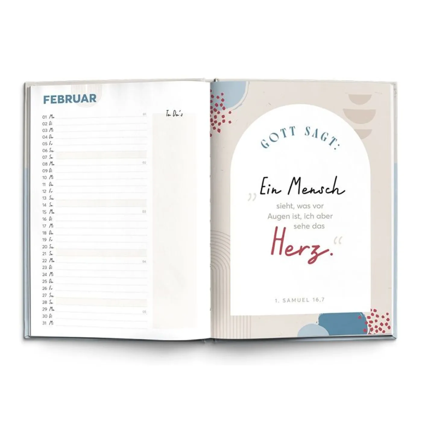 Anfangs eines jeden neuen Monats gibt es eine schmale Spalte des ganzen Monats und eine To-Do Spalte. Ein Bibelvers, der widerum eine Seite einnimmt lockert den Kalender auf. Darauf folgt auf der nächsten Doppelseite ein Impuls vd. Autorinnen mit anschließenden Reflexionsfragen.