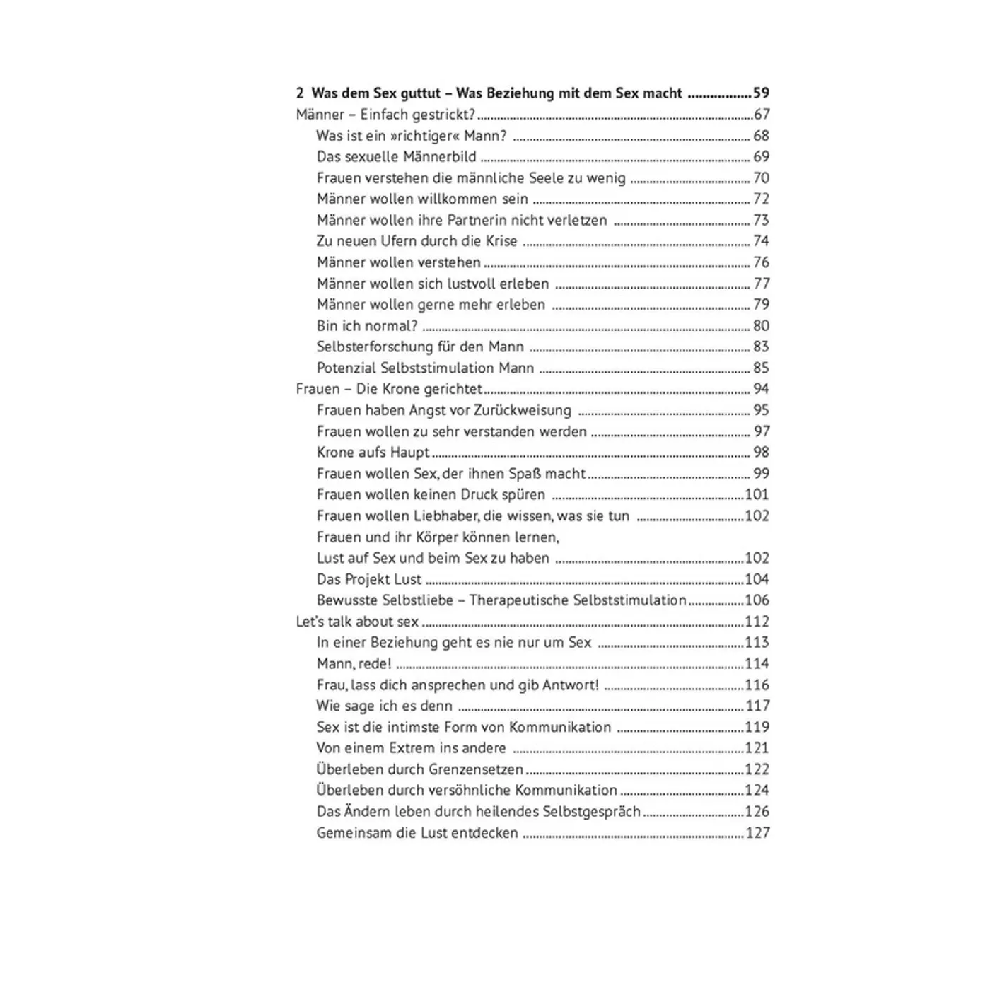 Überzeugt davon, dass wir „hemmungslose Körperlichkeit“ brauchen, weil sie unsere Seele nährt, sagt sie aber auch: „Wir brauchen regelmäßig Wärme, Nähe, Behutsamkeit, Leidenschaft, Ausgelassenheit, Anerkennung und Wertschätzung – all das kann Sex vermitteln.“ Nach ihren Tipps wie Sex mehr Spaß machen kann, betont sie, dass es in einer Beziehung nie nur um Sex geht und wie es den Liebenden gelingen kann, miteinander ins Gespräch zu kommen. Denn „Kommunikation ist der Schlüssel, damit es beim Sex oder in der Beziehung überhaupt klappt.“ (Seite 114). Dazu gehöre auch ein konstruktiver Streit, zu dem sie auf Seite 120 Vorschläge unterbreitet.