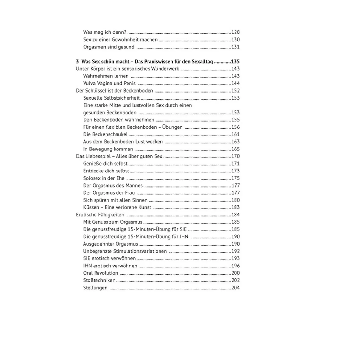 Der dritte Teil des Buches widmet sich dem Praxiswissen, dem, „was Sex schön macht“ (mit Übungen für beide Geschlechter) – bevor sie zum Abschluss all das zur Sprache bringt, was Sex verhindert. Alles in allem beschreitet dieser Ratgeber, der für junge Paare, die die Sexualität erst erkunden, ebenso brauchbar ist, wie für die Paare, deren Beziehung in die Jahre gekommen ist und einzuschlafen droht, einen guten Weg. Wenn er rechtzeitig zur Hand genommen wird, kann er sicher so manche Trennung verhindern.