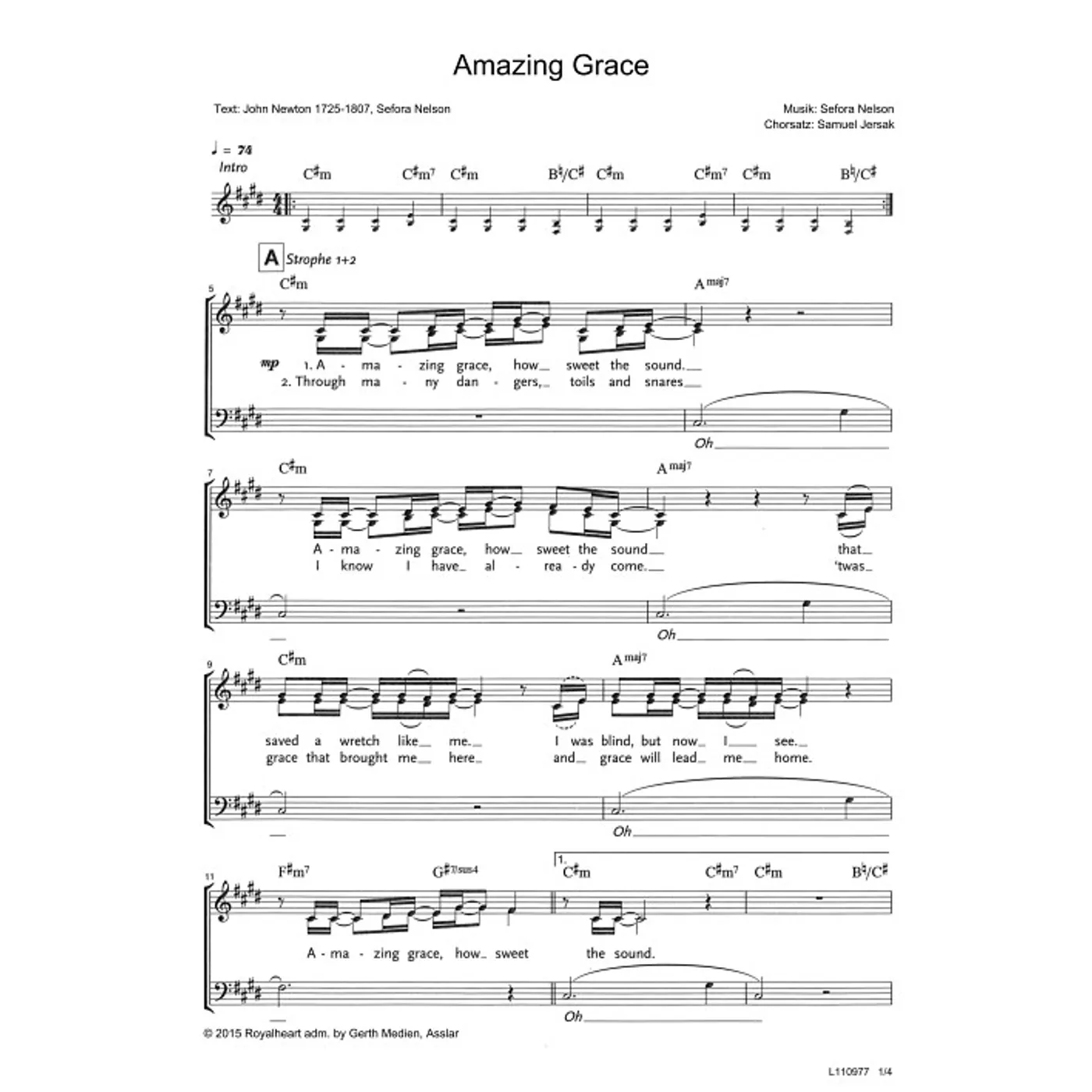 Amazing Grace (diese Variante haben Sie gerade ausgewählt) (modern, gemischter Chor, mit Akkorden, vierstimmig, Cis-Moll) Samuel Jersak (Chorsatz), Sefora Nelson (Komposition, Text) |