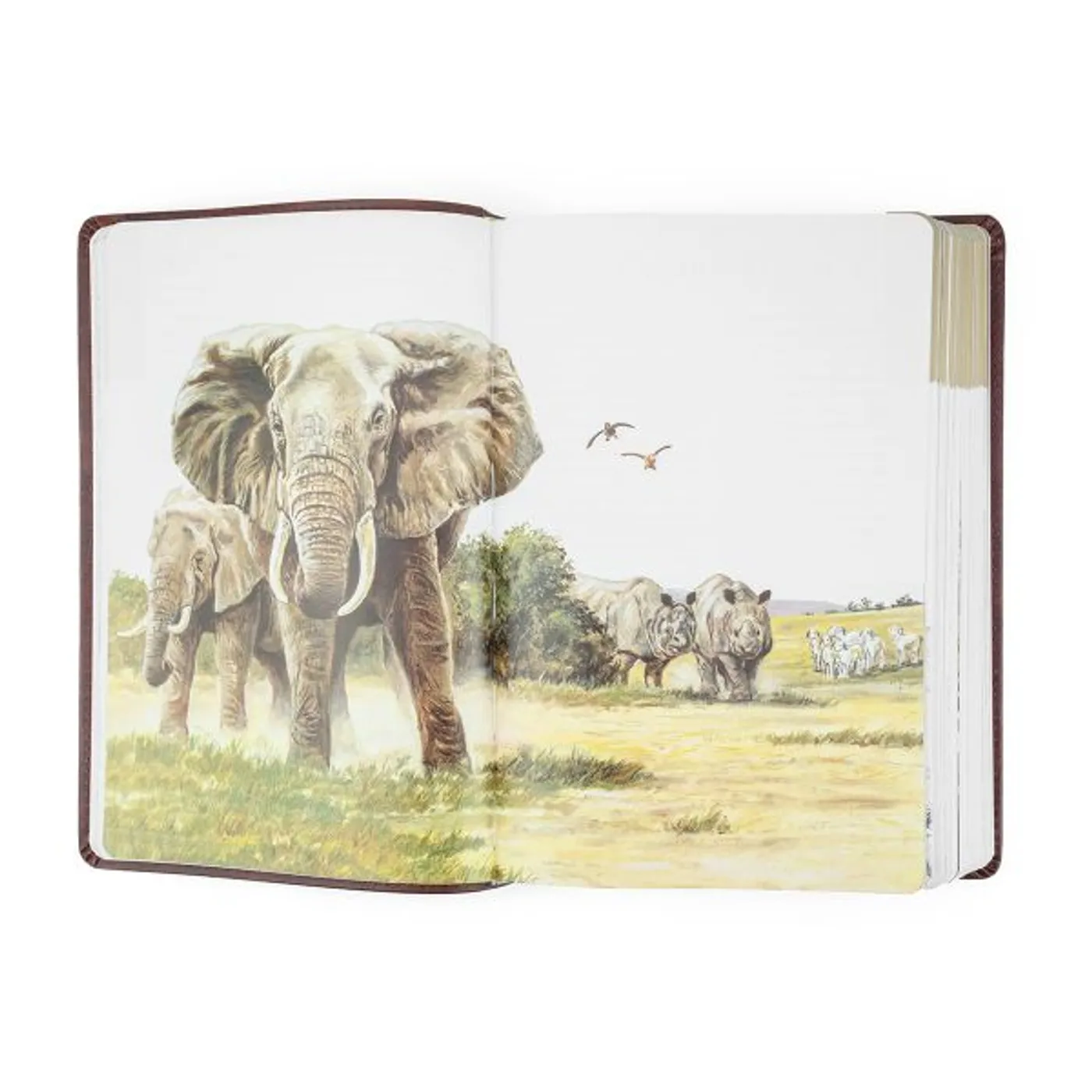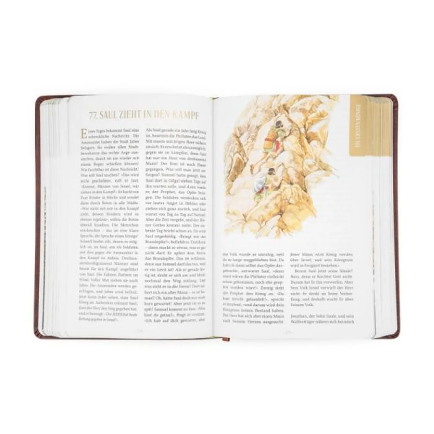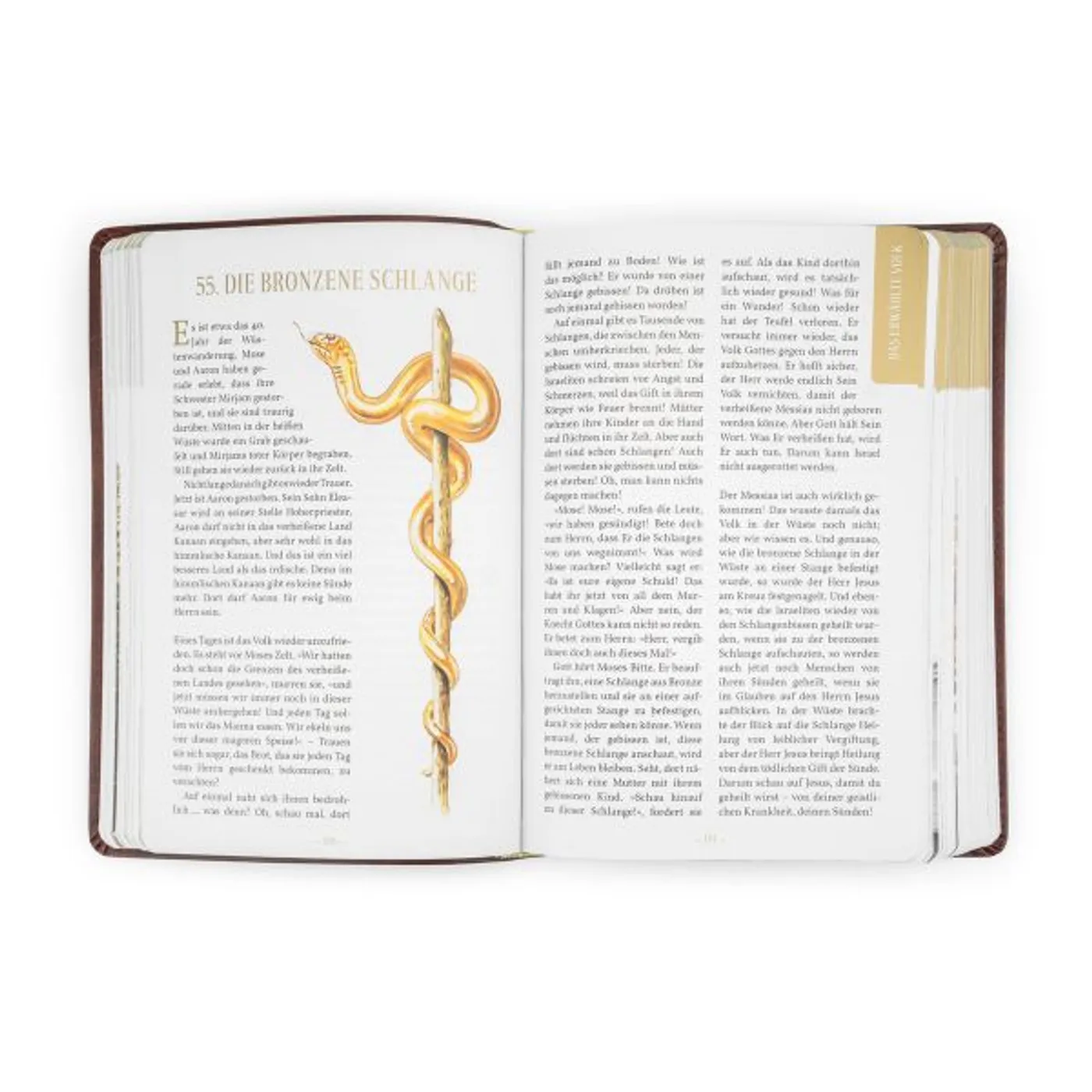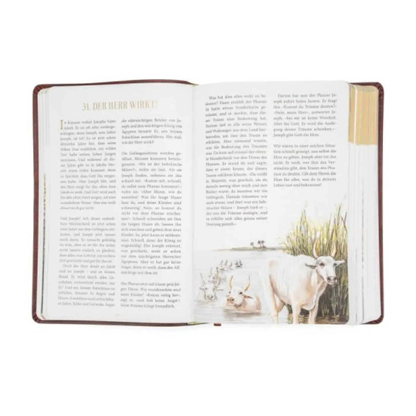 Besonders hervorzuheben ist die durchdachte Gestaltung: Die farblich abgesetzten Elemente, die realistischen Illustrationen in verschiedenen Maltechniken und die hochwertig verarbeitete äußere Form (Kunstledereinband mit Goldprägung, Leseband, stabile Bindung) machen das Buch auch optisch und haptisch zu einem wertvollen Begleiter im Familienalltag.