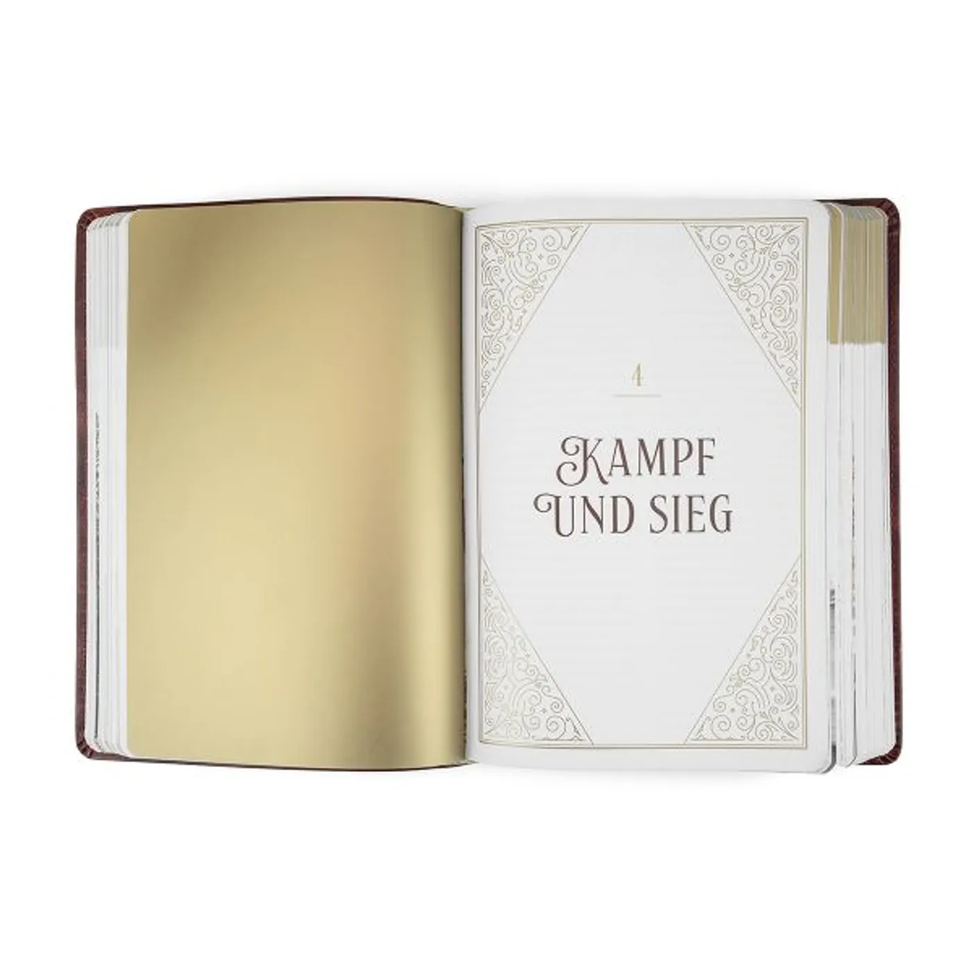 Der Voice of Hope Verlag ist inzwischen dafür bekannt, dass er sehr hochwertige Bücher herausgibt und dazu zählt dieses ganz sicher. Es hat einen flexiblen Kunstledereinband mit Nähten, abgerundete Ecken und einer Goldprägung. Auch eine Leseband für die tägliche Markierung ist vorhanden. Das Buch hat ein großzügiges Format, bei einem Gewicht von rund 1,3 kg liegt es noch angenehm in der Hand.