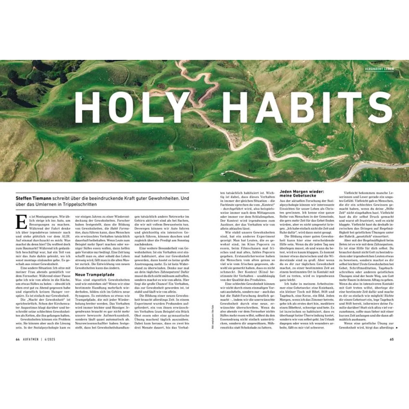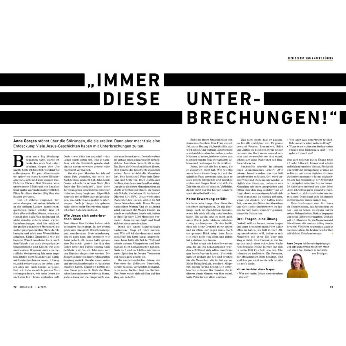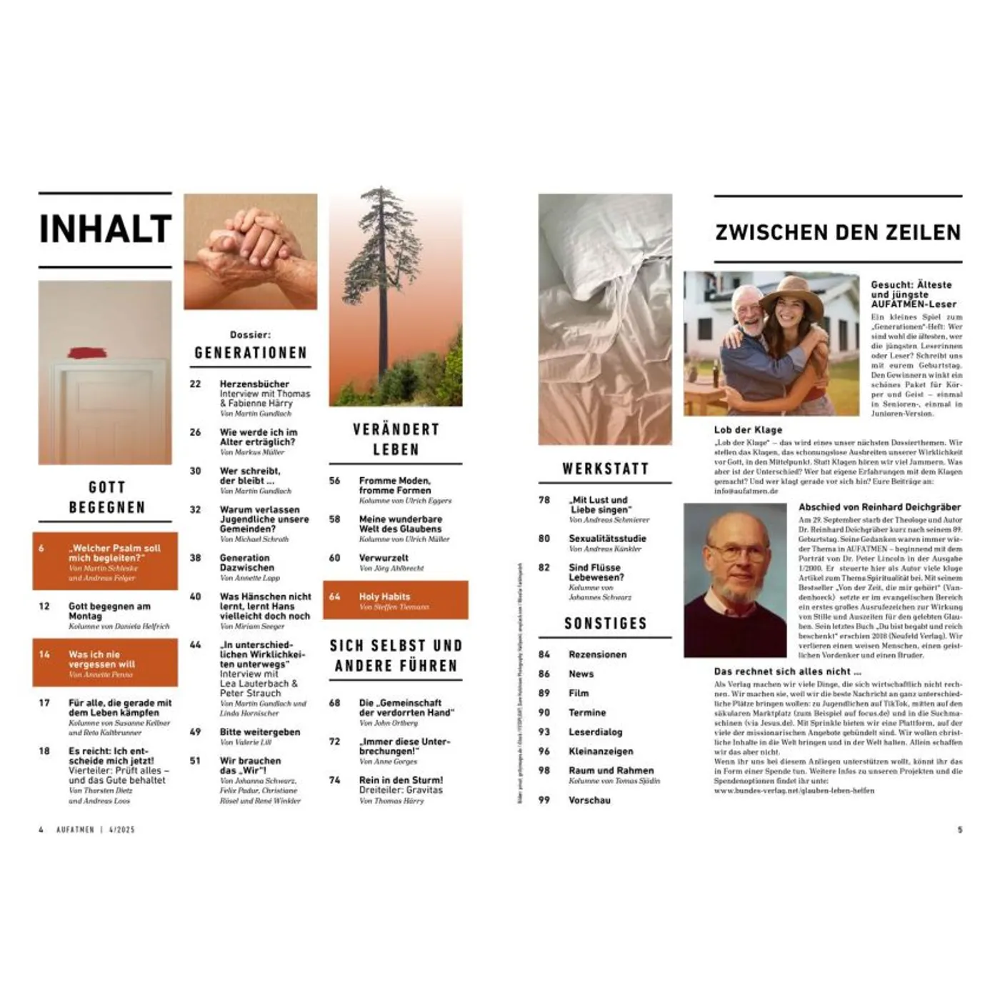 Gottes Wirklichkeit erfahren AUFATMEN ist das Magazin für Frauen und Männer, die Gott tiefer vertrauen und persönlich wachsen wollen. In jeder Ausgabe finden sich ehrliche Porträts, inspirierende Gottes-Erfahrungen, persönliche Einblicke und Herausforderungen für Kopf und Herz. Besonders für seine offenen authentischen Berichte über Fragen, Zweifel und Neuanfänge ist das AUFATMEN-Magazin bekannt. Die Zeitschrift fordert dazu heraus, mitten im Alltag aufmerksam zu werden für Gottes Gegenwart und Wirken. Hin zu einem Glauben, der immer weiter, freier und tiefer wird. Neue Horizonte öffnen In jeder Ausgabe gibt es ein Dossier, das Fragen vertieft bearbeitet und neues Denken anstößt. Themenschwerpunkte sind beispielsweise „Einheit“, „Heimat“, „Gott hören“ oder „Scham“. Außerdem in jedem Heft: „Werkstatt Gemeinde“ mit Tipps und Erfahrungswerten für Menschen, die aktiv Kirche und Gemeinde gestalten wollen. Was andere über AUFATMEN sagen: „Wer etwas tun möchte für Lebendigkeit und Mündigkeit seines Glaubens, liegt bei AUFATMEN genau richtig: Die Lektüre ist immer wieder anregend, bewegt sich jenseits ausgetretener Pfade, fordert heraus und macht Beine!“ Prof. Dr. Michael Herbst, Universität Greifswald