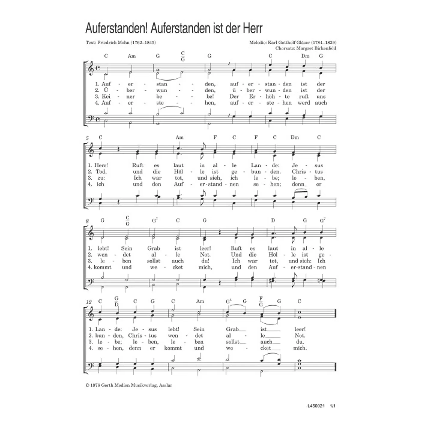 (traditionell, gemischter Chor, mit Akkorden, vierstimmig, C-Dur) Karl Gotthelf Gläser (Komposition), Friedrich Mohn (Text), Margret Birkenfeld (Bearbeiter)