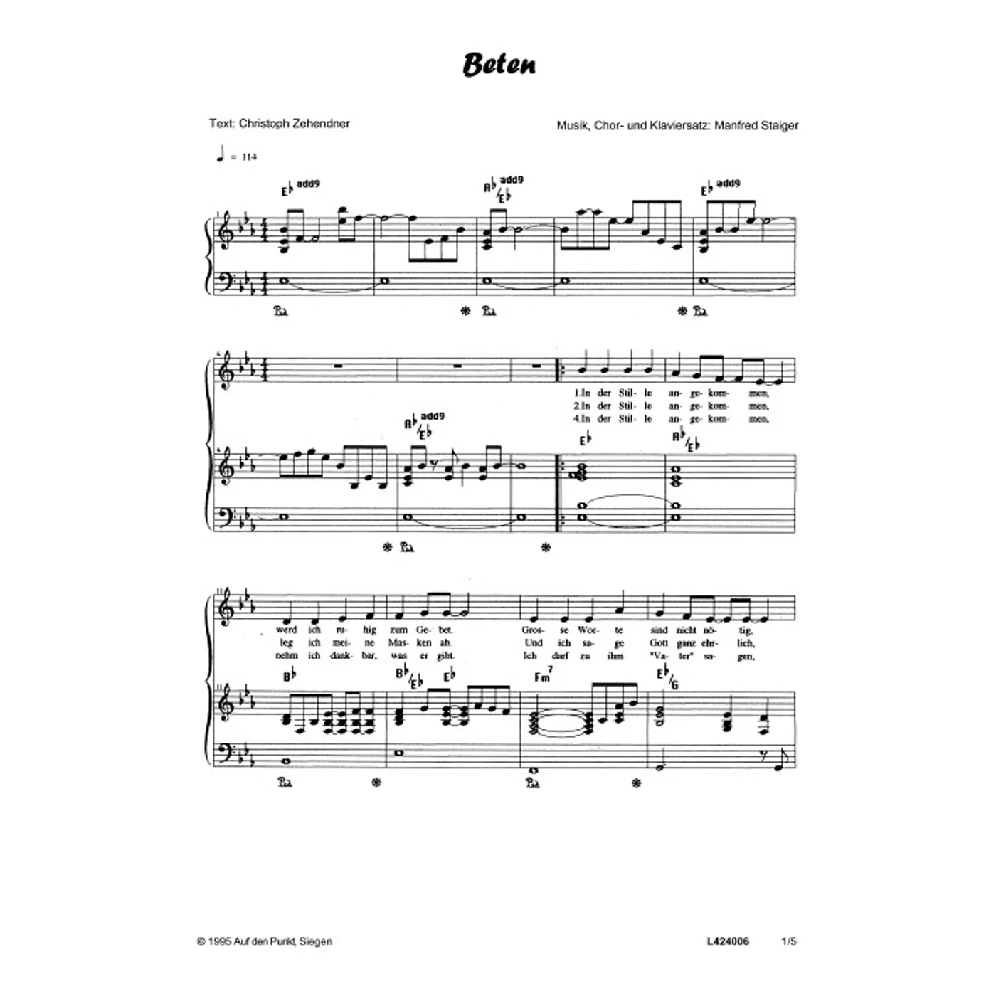 Beten (modern, gemischter Chor, mit Akkorden, vierstimmig, Es-Dur) Christoph Zehendner (Text), Manfred Staiger (Komposition, Bearbeiter) | modern, gemischter Chor, mit Akkorden, vierstimmig, Es-Dur | 1,50 € |