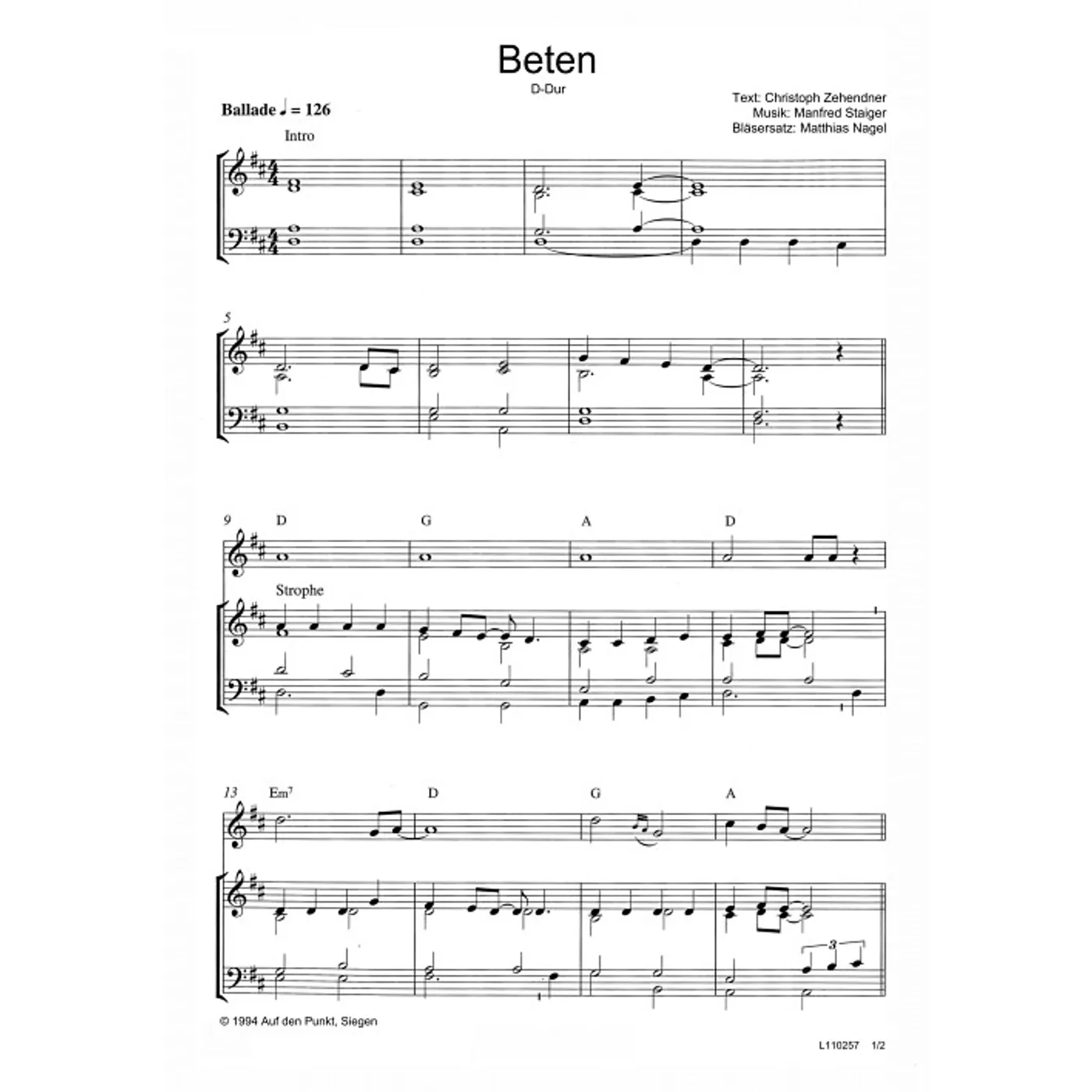 Beten (diese Variante haben Sie gerade ausgewählt) (modern, Bläser, Bläserpartitur, Partituren, mit Akkorden, vierstimmig, D-Dur) Manfred Staiger (Komposition), Matthias Nagel (Bearbeiter), Christoph Zehendner (Text) |