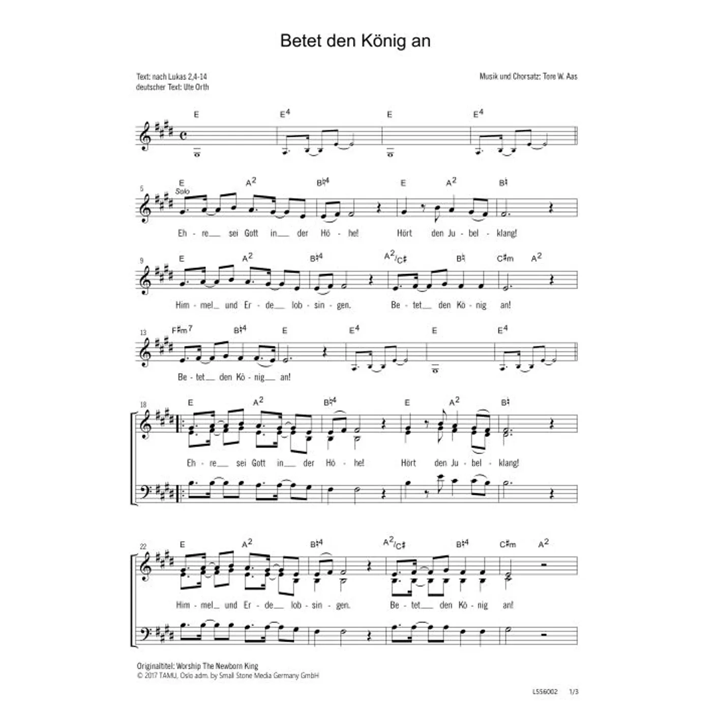 Betet den König an (diese Variante haben Sie gerade ausgewählt) (modern, gemischter Chor, mit Akkorden, vierstimmig, E-Dur) Tore W. Aas (Komposition, Chorsatz), Ute Orth (Übersetzung) |