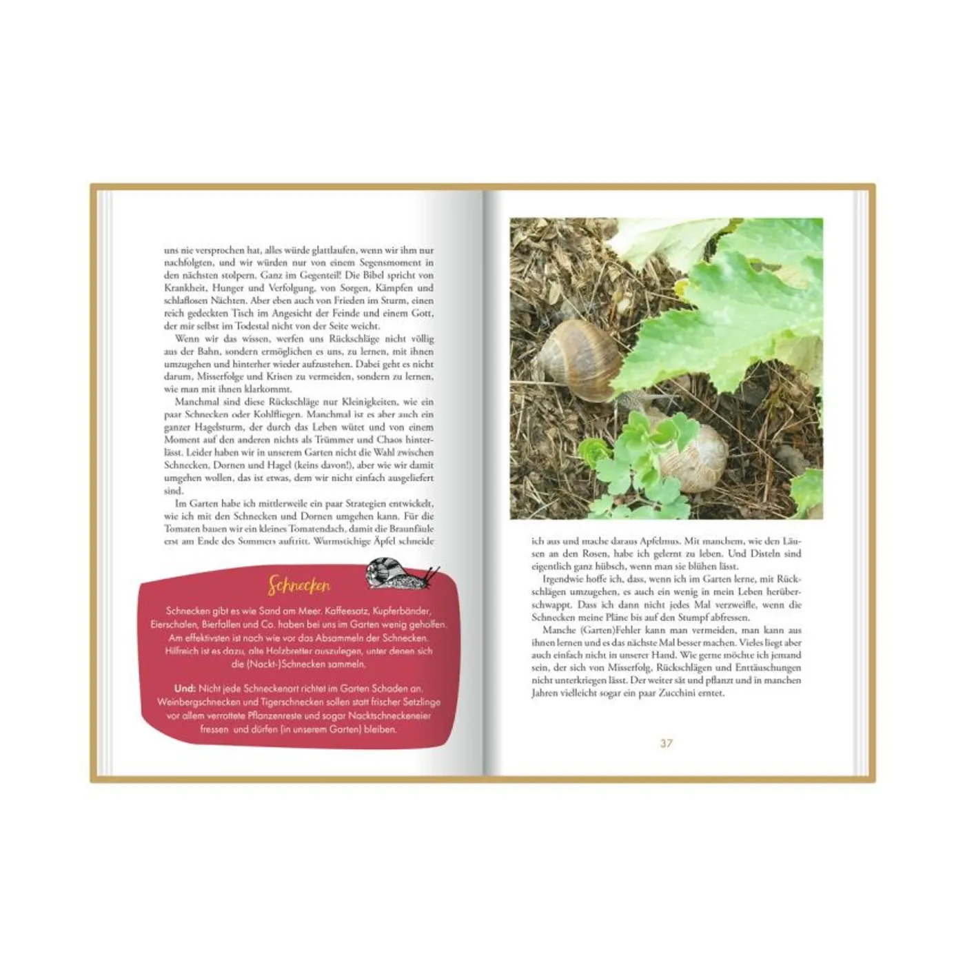 Letztendlich geht es der Autorin um zwei große Themen: erstens, dass ein kleines Samenkorn Großes hervorbringt, es dafür aber sterben muss, um in neuer Form wiederaufzuerstehen. Zweitens, wie sehr sie in ihrem Garten aktiv ist. Dass die Arbeit in einem Garten hart ist, es subjektiv mehr Rückschläge als Erfolge gibt und das Unkraut schneller wächst als Bohnen und Tomaten. An mancher Stelle kam es mir fast so vor, als wolle sie sich rechtfertigen, wie sehr sie sich bemüht. Doch ohne Segen von oben geht es halt auch nicht, darauf geht sie leider wenig ein.