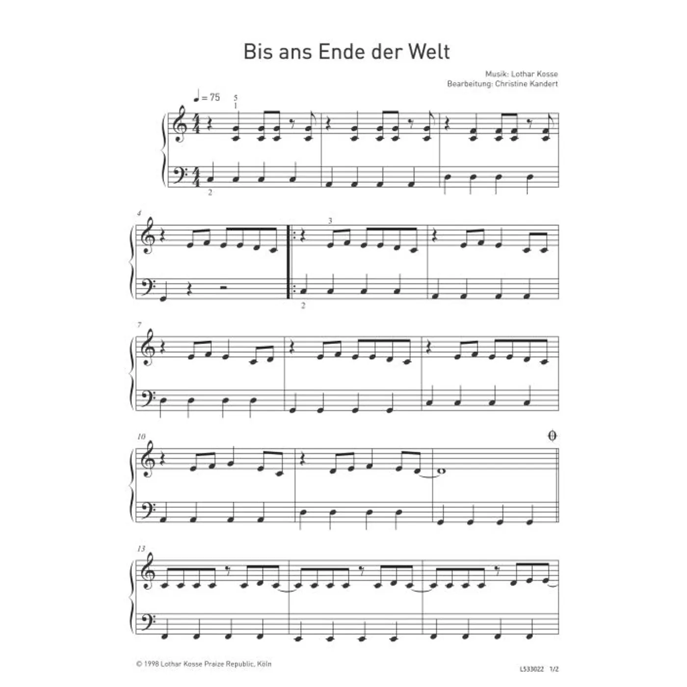 Bis ans Ende der Welt (modern, Klavier, Klavierpartitur, Orchestereinzelstimme, Partituren, mit Akkorden, C-Dur) Lothar Kosse (Komposition), Christine Kandert (Klaviersatz) | modern, Klavier, Klavierpartitur, Orchestereinzelstimme, Partituren, mit Akkorden, C-Dur | 2,80 € |