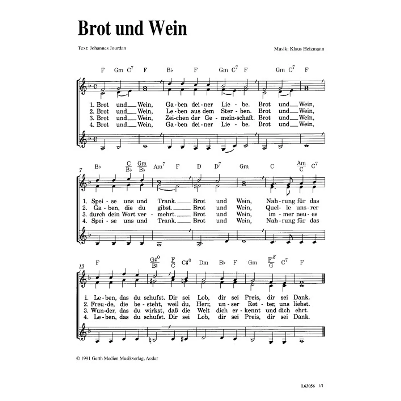 Brot und Wein (diese Variante haben Sie gerade ausgewählt) (traditionell, Frauenchor, mit Akkorden, F-Dur) Klaus Heizmann (Komposition), Johannes Jourdan (Text) |