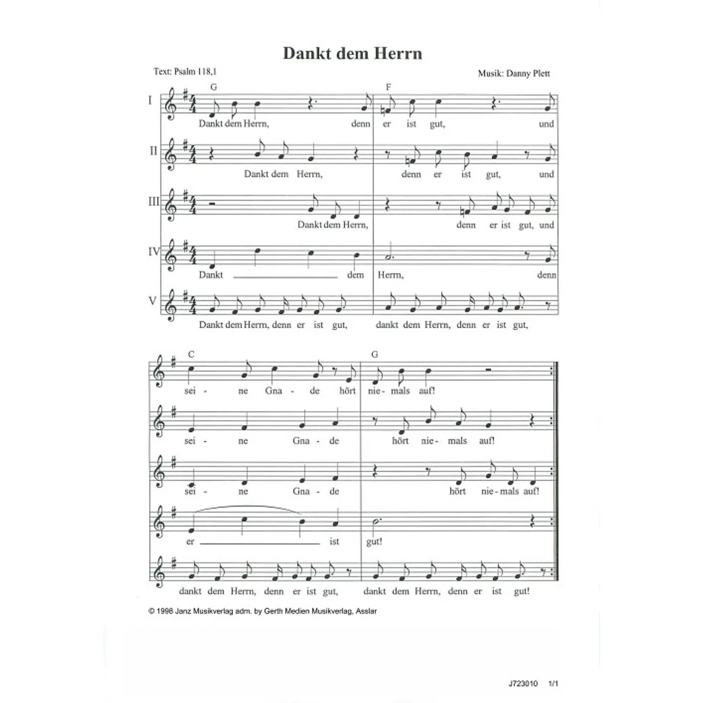Dankt dem Herrn (diese Variante haben Sie gerade ausgewählt) (Backings, Kinderchor, einstimmig, mit Akkorden, G-Dur) Danny Plett (Komposition) |