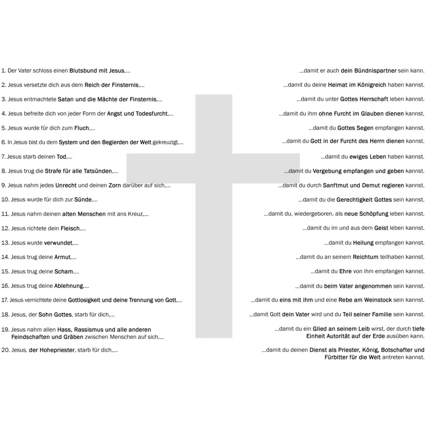 Der Tod Jesu am Kreuz ist das wichtigste Ereignis der gesamten Menschheitsgeschichte. Alle Geschehnisse auf dieser Erde drehen sich um Jesus und seinen Sieg auf Golgatha. Doch die wichtigste Frage ist: Welche Bedeutung hat das Kreuz in deinem Leben? Was hat Christus für dich am Kreuz getan? Sind dir die Wunder, Geschenke und Wahrheiten des Kreuzes in deinem Alltag bewusst und haben sie die Kraft, dich aus Bedrängnis, Furcht und Anfechtung herauszureißen?