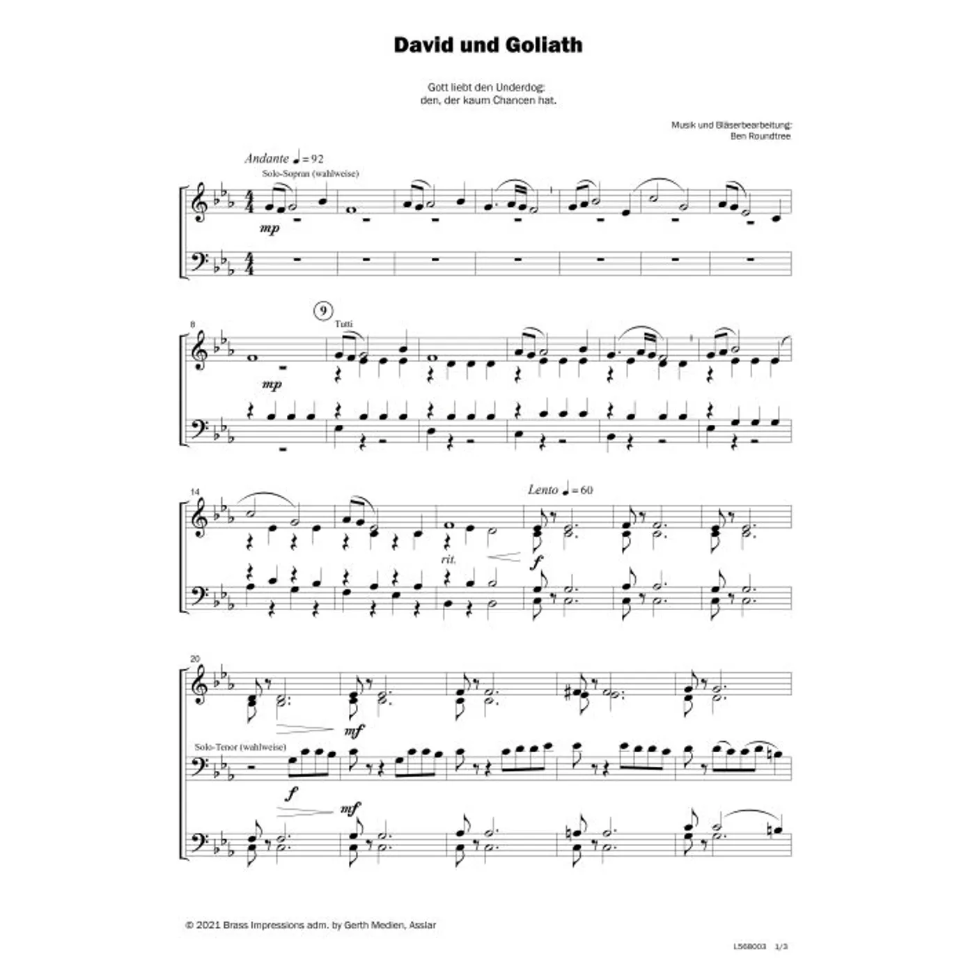 David und Goliath David und Goliath (modern, Bläser, Bläserpartitur, Partituren, vierstimmig) Ben Roundtree (Komposition, Bläsersatz) modern, Bläser, Bläserpartitur, Partituren, vierstimmig 2,80 €