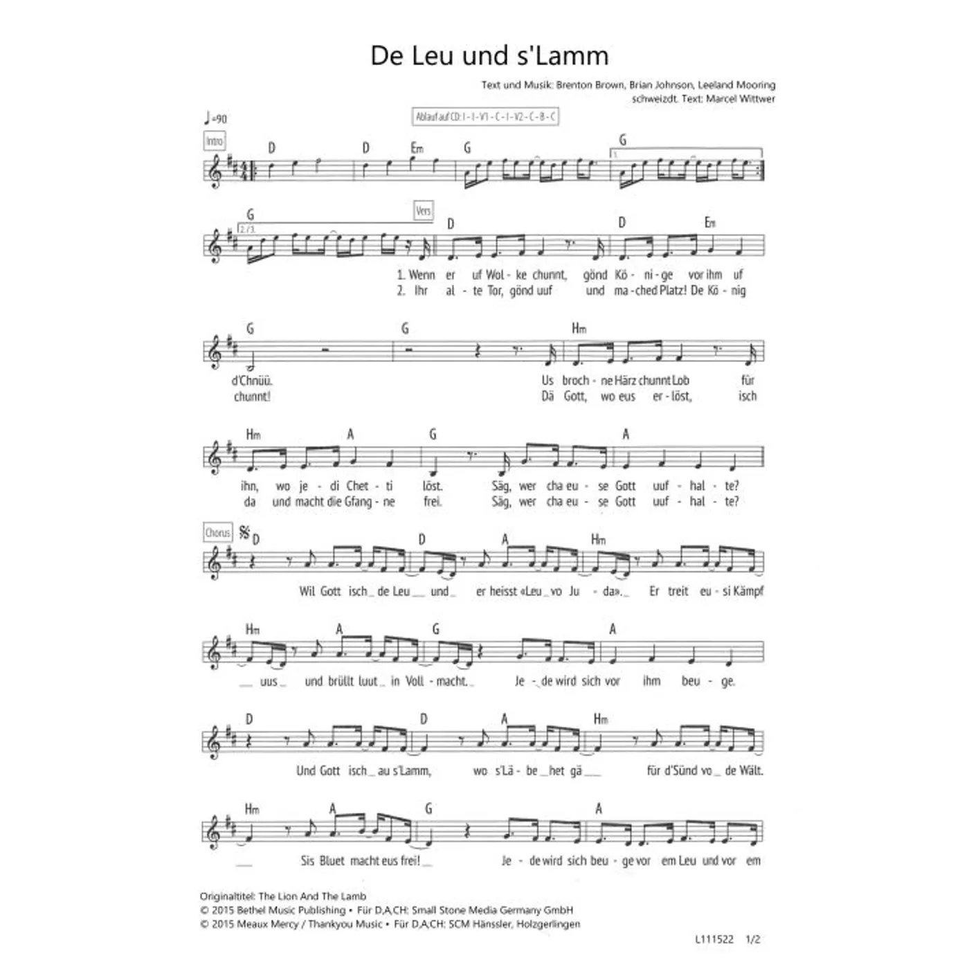 De Leu und s'Lamm (diese Variante haben Sie gerade ausgewählt) (Gemeindelied, einstimmig, mit Akkorden, G-Dur) Brenton Brown (Komposition, Text), Brian Johnson (Komposition, Text), Leeland Mooring (Komposition, Text), Marcel Wittwer (Übersetzung) |