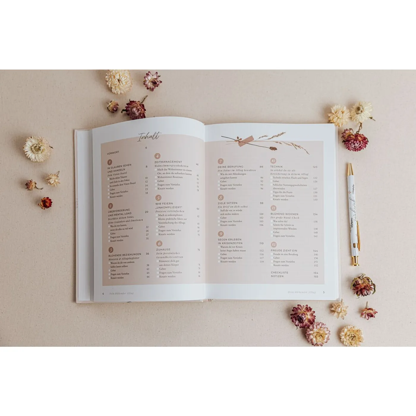 Anfangs geht es um Wünsche, Träume und Ziele. Wie kann ich was umsetzen? Das Sortieren der vielen Gedanken im Kopf und Ruheorte in meinem Umfeld schaffen. Gut gefallen haben mir die Gedankenanstöße rund um Handy, Social Media und Co. Wie kann ich stattdessen meine Zeit besser umsetzen? Was möchte Gott von mir? Auch ein blühendes Zuhause gestalten, wird schön aufgegriffen.