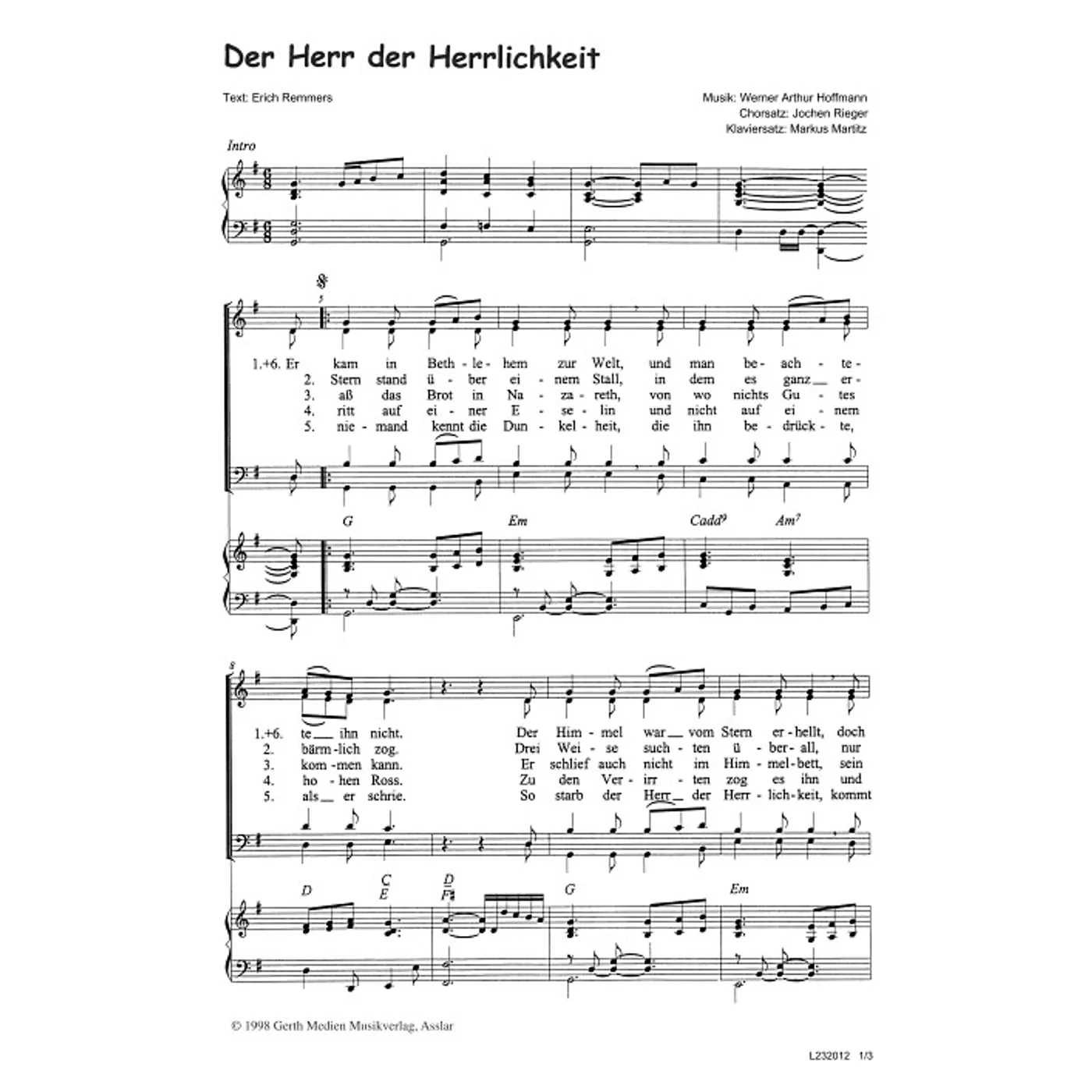 Der Herr der Herrlichkeit (diese Variante haben Sie gerade ausgewählt) (traditionell, Klavier, gemischter Chor, mit Akkorden, vierstimmig, G-Dur) Werner A. Hoffmann (Komposition), Erich Remmers (Text), Jochen Rieger (Chorsatz), Markus Martitz (Klaviersatz) |