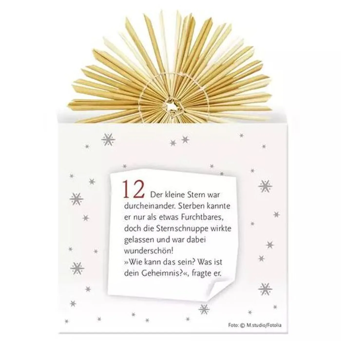 Die Strohsterne sind liebevoll in einzelne Papiersachets verpackt, die für jeden Tag einen adventlichen Impuls bereit halten und auf denen die Fortsetzungsgeschichte »Vom kleinen Stern, der strahlen wollte« zu lesen ist. Vorfreude auf den nächsten Adventstag und Unterhaltung für Groß und Klein ist damit garantiert.