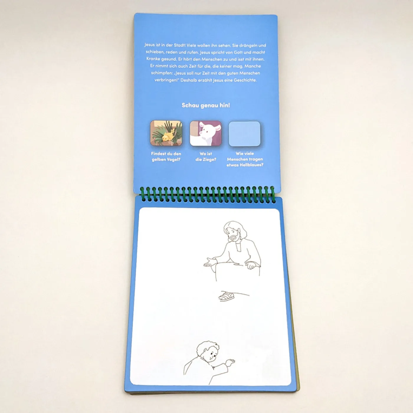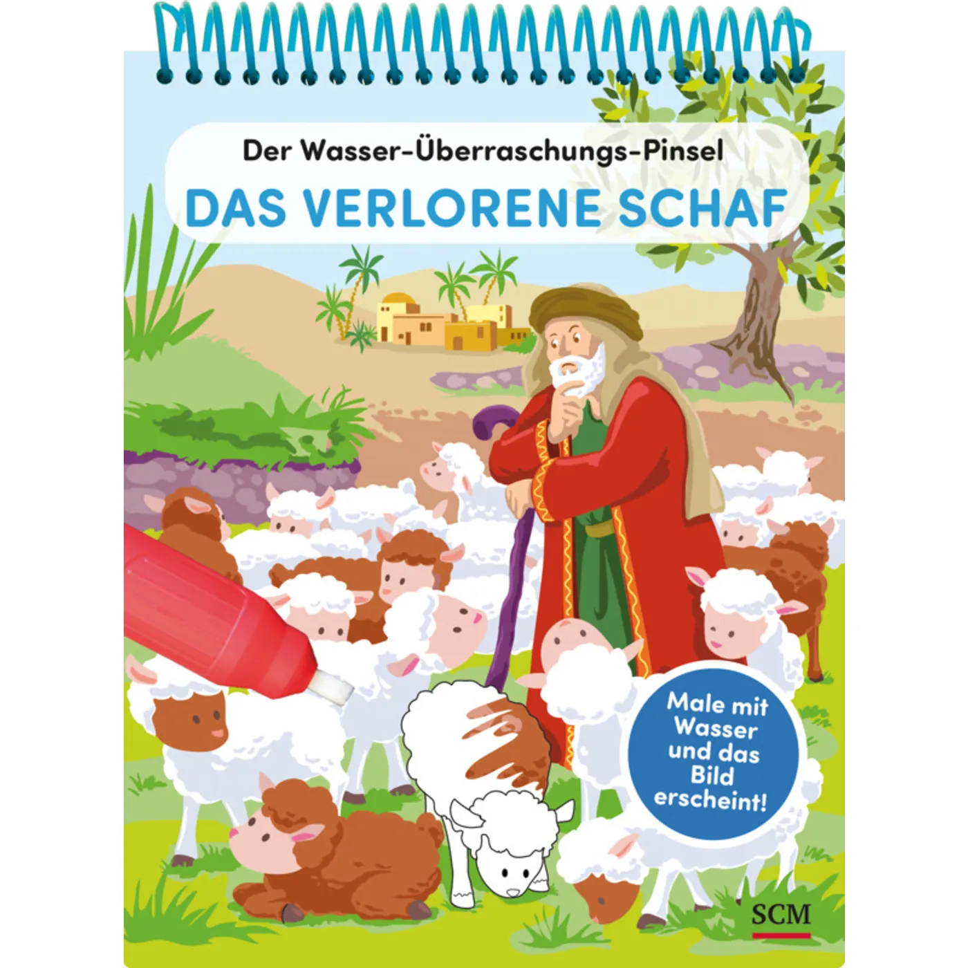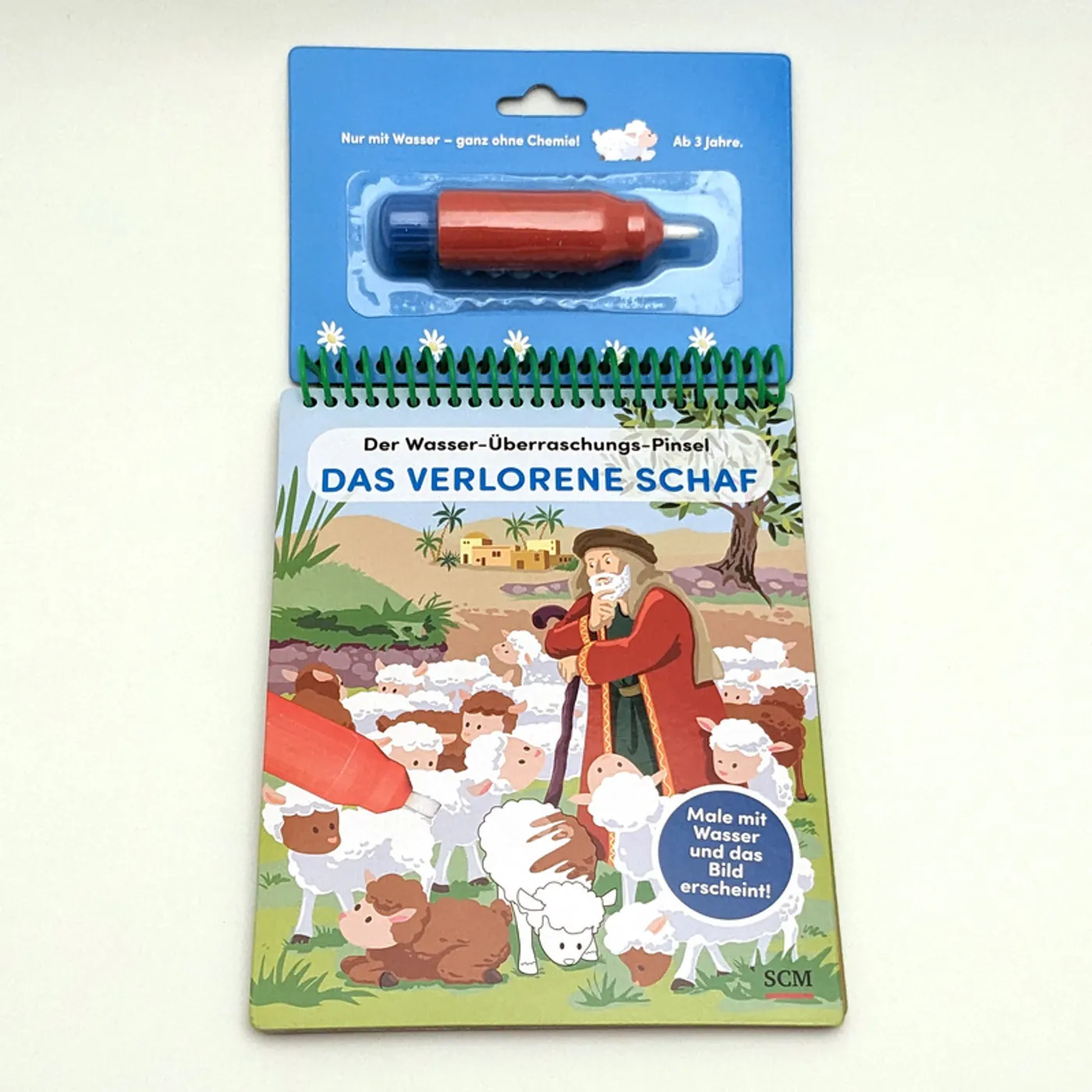 Auf 5 Doppelseiten wird die Geschichte vom verlorenen Schaf kindgerecht erzählt und kann mit einem Wasserpinsel entdeckt werden. Die Bilder sind nämlich zu erst weiß, nur ein paar Figuren oder Tiere sind schwarz umrandet. Sobald man aber mit dem Pinsel (wird mit geliefert!) darüberstreicht, werden die Bilder bunt. Wenn das Wasser verdunstet ist, werden die Seiten wieder weiß und der Spaß kann von Neuem beginnen.☺️
