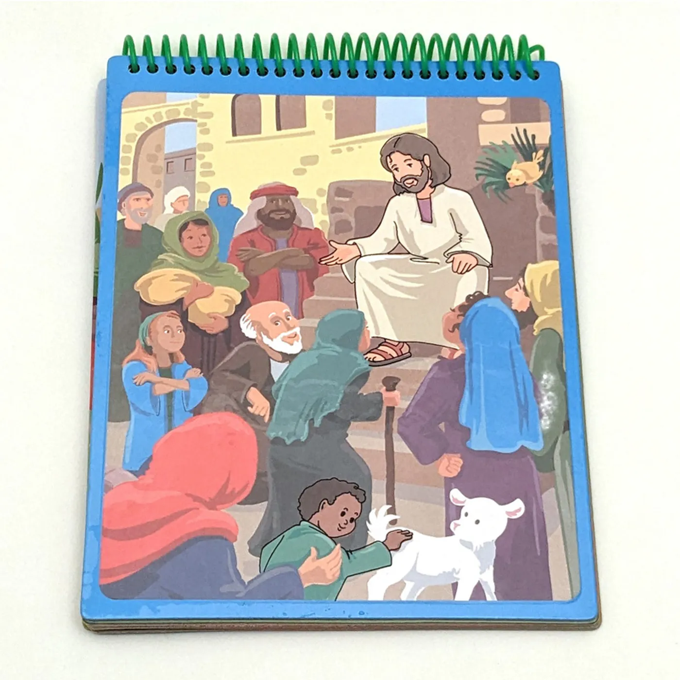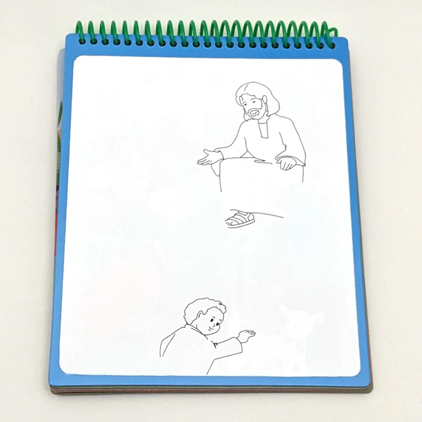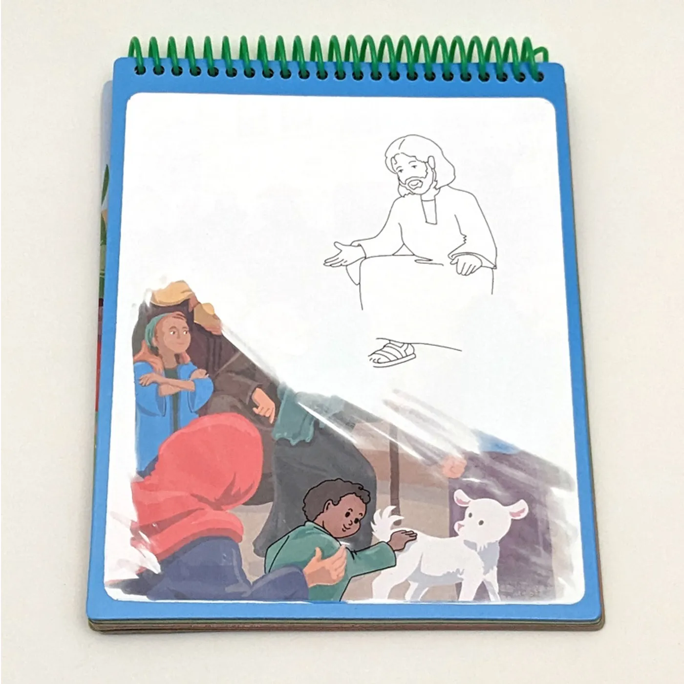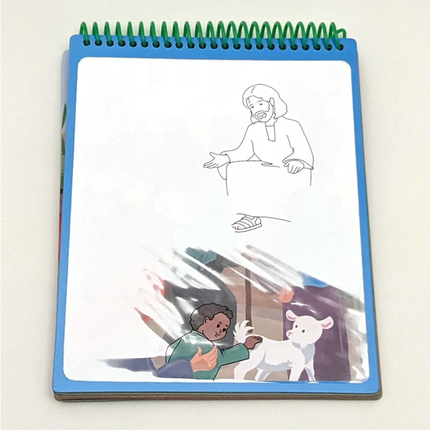 Auf 5 Doppelseiten wird die Geschichte vom verlorenen Schaf kindgerecht erzählt und kann mit einem Wasserpinsel entdeckt werden. Die Bilder sind nämlich zu erst weiß, nur ein paar Figuren oder Tiere sind schwarz umrandet. Sobald man aber mit dem Pinsel (wird mit geliefert!) darüberstreicht, werden die Bilder bunt. Wenn das Wasser verdunstet ist, werden die Seiten wieder weiß und der Spaß kann von Neuem beginnen.☺️