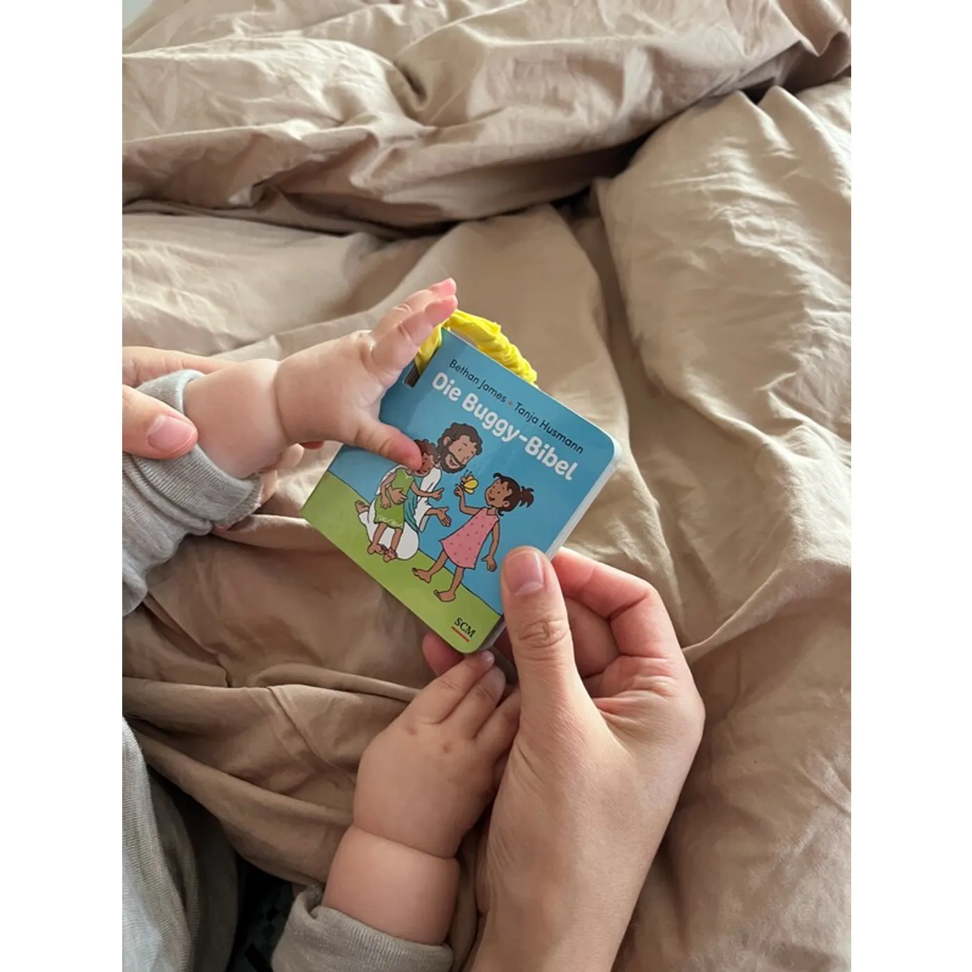 -Band durch das Buch, -den gelben Clip am Buggy einhaken und der Spaziergang mit Buch kann losgehen. Die Mini-to-go-Bibel für die jüngeren Kinder ist aus stabiler Pappe und hat zur Sicherheit abgerundete Ecken. Das Format (im Quadrat 9 X 9cm) ist für kleine Kinderhände griffig und die Seiten lassen sich gut umblättern. Beschrieben und bebildert werden die Schöpfungsgeschichte, Noah und die Arche, Jesus wird geboren, die Geschichte vom guten Hirten. Der Text „Gott liebt Kinder“, Zitat: „Kinder sind für Jesus wichtig. Er nimmt sich Zeit für sie und zeigt, dass Gott uns alle sehr lieb hat“, schließt die Sammlung ab.