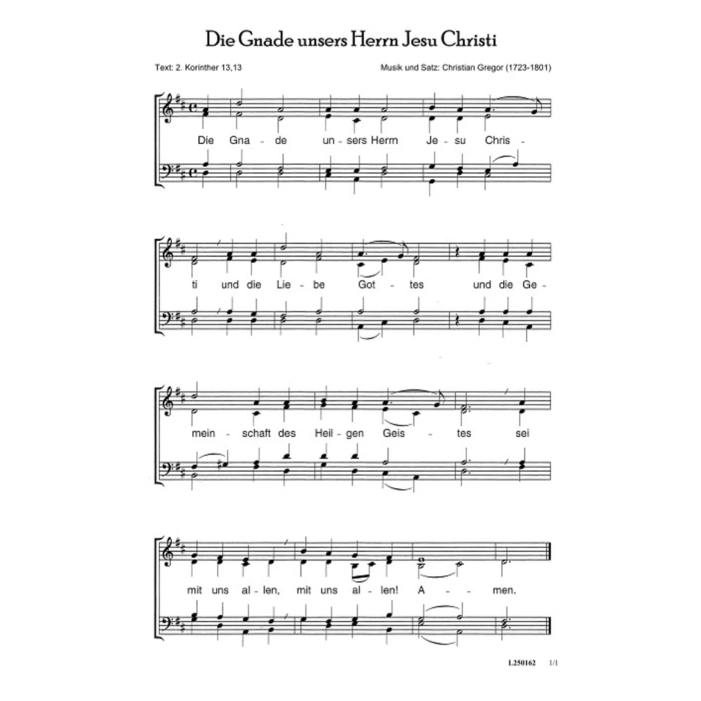 Die Gnade unsers Herrn Jesu Christi (diese Variante haben Sie gerade ausgewählt) (Gemeindelied, traditionell, gemischter Chor, vierstimmig) Christian Gregor (Komposition) |