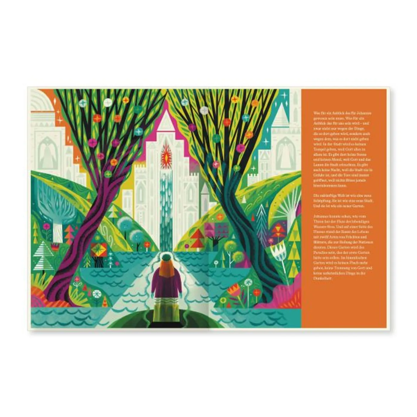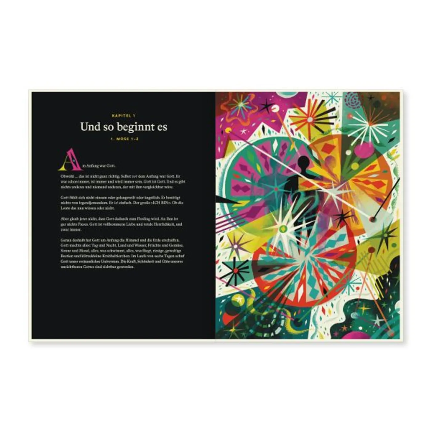 Diese Kinderbibel ist ein farbenfrohes Buch – es gibt tatsächlich kein weiße Seite – wo die Kinder viel zu gucken und zu entdecken haben. Am besten geeignet ist sie ab dem Grundschulalter, sowohl zum Vorlesen, als auch zum Selbstlesen, wenn die Kinder schon größer sind.
