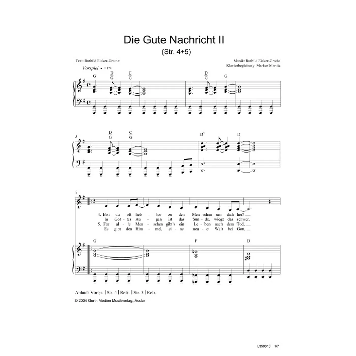 Die Gute Nachricht II (Str. 4+5) (diese Variante haben Sie gerade ausgewählt) (Kinderchor, Klavier, gemischter Chor, mit Akkorden, G-Dur) Ruthild Eicker (Komposition, Text), Markus Martitz (Bearbeiter) |