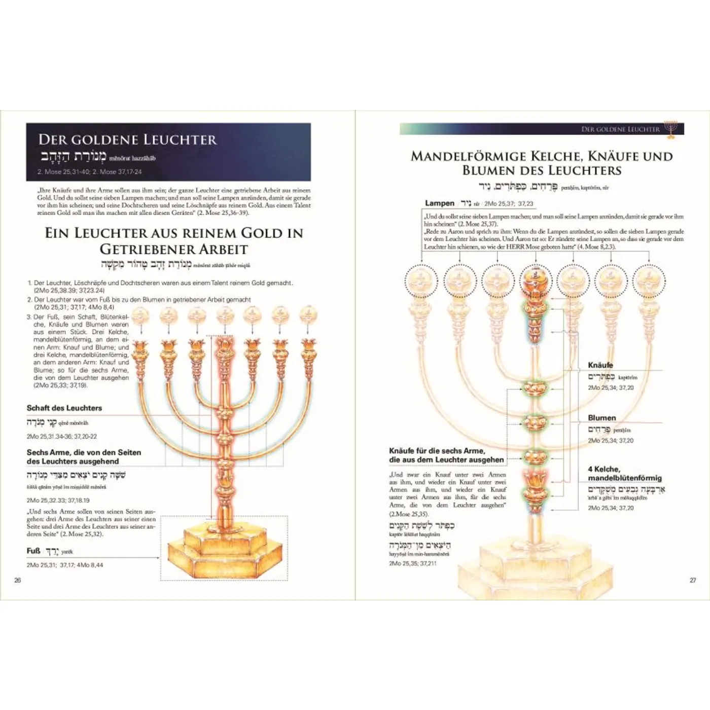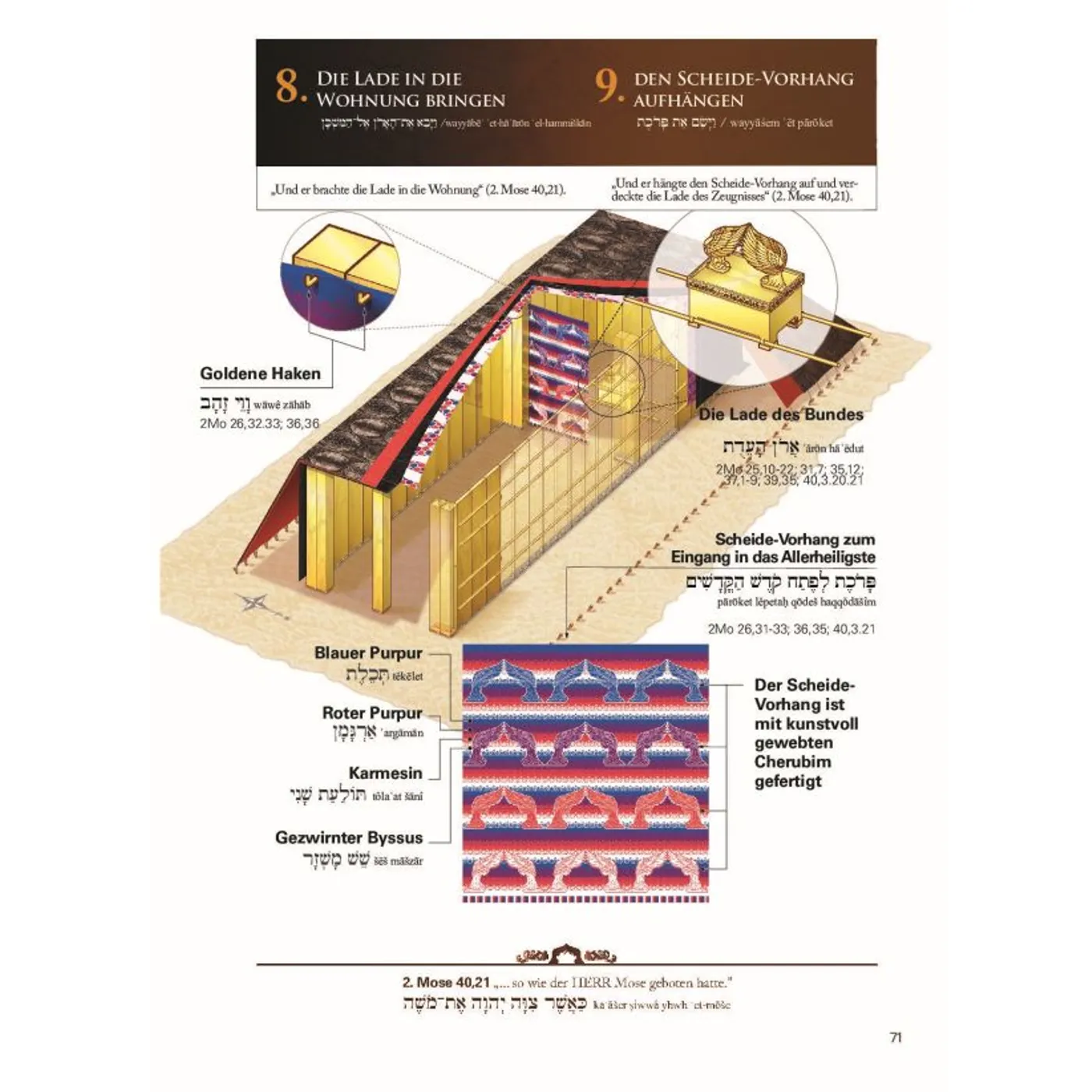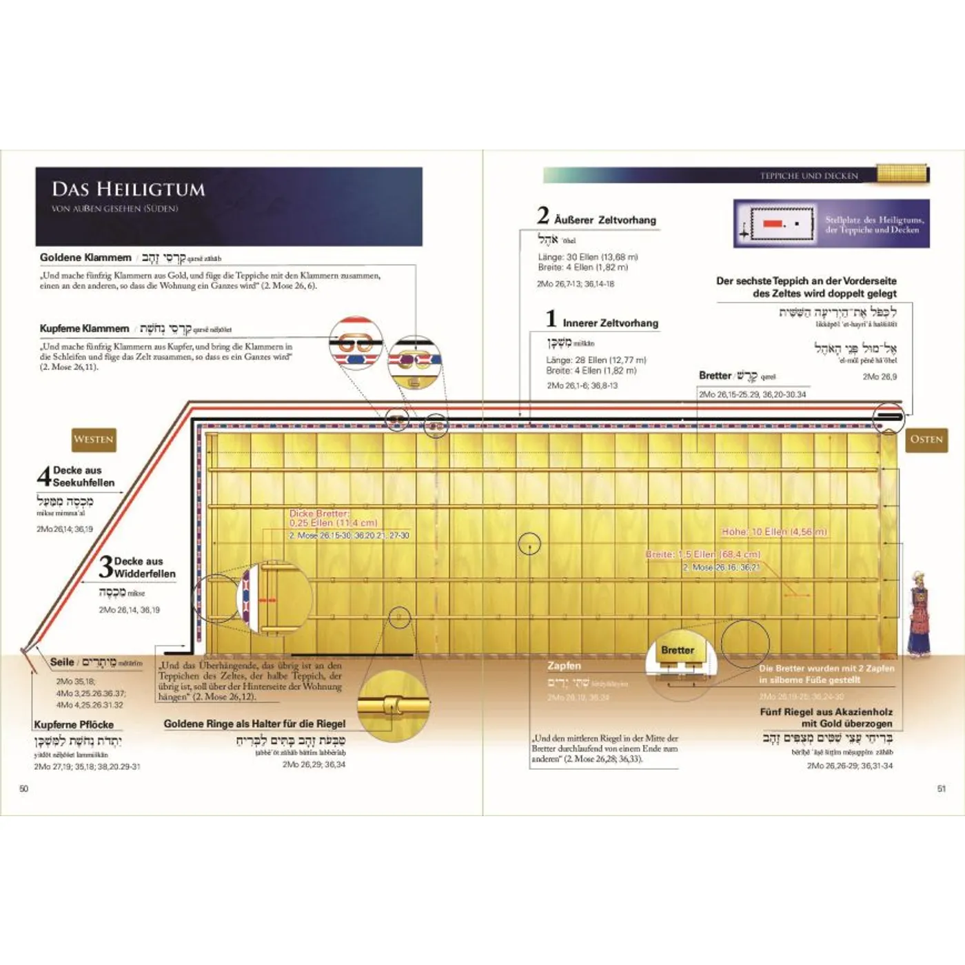 Die Stiftshütte war das Wanderheiligtum, das Gott von Mose in der Wüste errichten ließ. Vor dem Bau des salomonischen Tempels war die Stiftshütte das Zentrum der Anbetung der Hebräer und beherbergte unter anderem die Bundeslade, in der die Gesetzestafeln aufbewahrt wurden. Dieses einzigartige große Farbbuch bietet eine sehr detaillierte Beschreibung der Stiftshütte, ihrer Gegenstände und Utensilien, begleitet von den entsprechenden Bibelstellen.