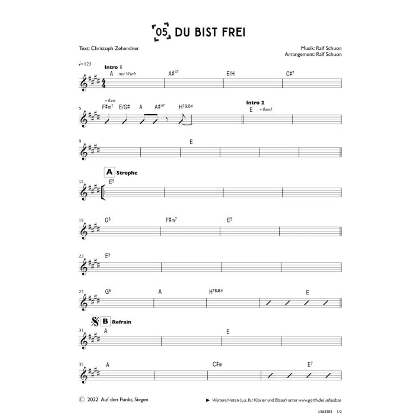 Du bist frei (Chor) (Gemeindelied, gemischter Chor, mit Akkorden, vierstimmig, E-Dur) Christoph Zehendner (Text), Hans-Joachim Eißler (Chorsatz), Ralf Schuon (Chorsatz, Komposition) | Gemeindelied, gemischter Chor, mit Akkorden, vierstimmig, E-Dur | 2,00 € | ||