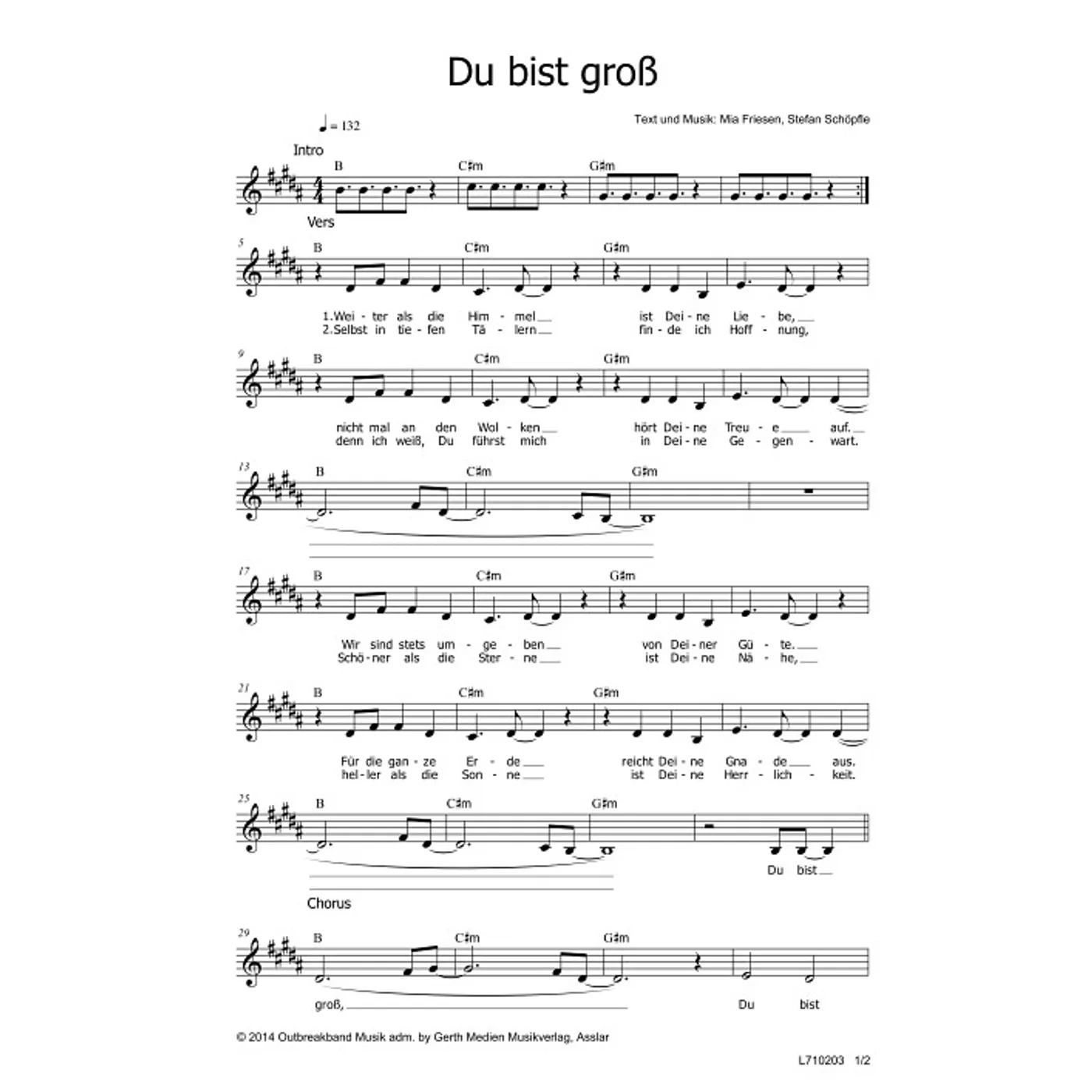 Du bist groß (diese Variante haben Sie gerade ausgewählt) (einstimmig, mit Akkorden, h-Dur) Mia Friesen (Komposition, Text), Stefan Schöpfle (Komposition, Text) |