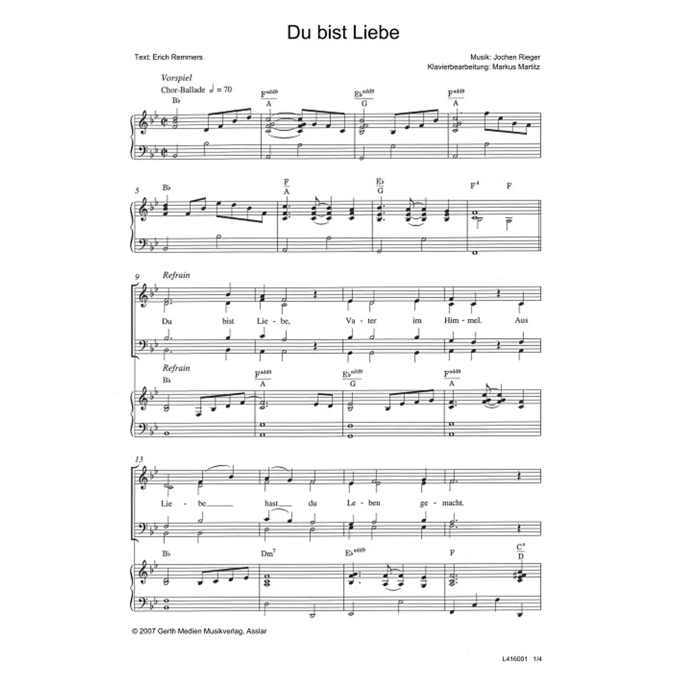 Du bist Liebe (diese Variante haben Sie gerade ausgewählt) (modern, Klavier, gemischter Chor, mit Akkorden, vierstimmig, B-Dur) Jochen Rieger (Komposition), Erich Remmers (Text), Markus Martitz (Klaviersatz) |