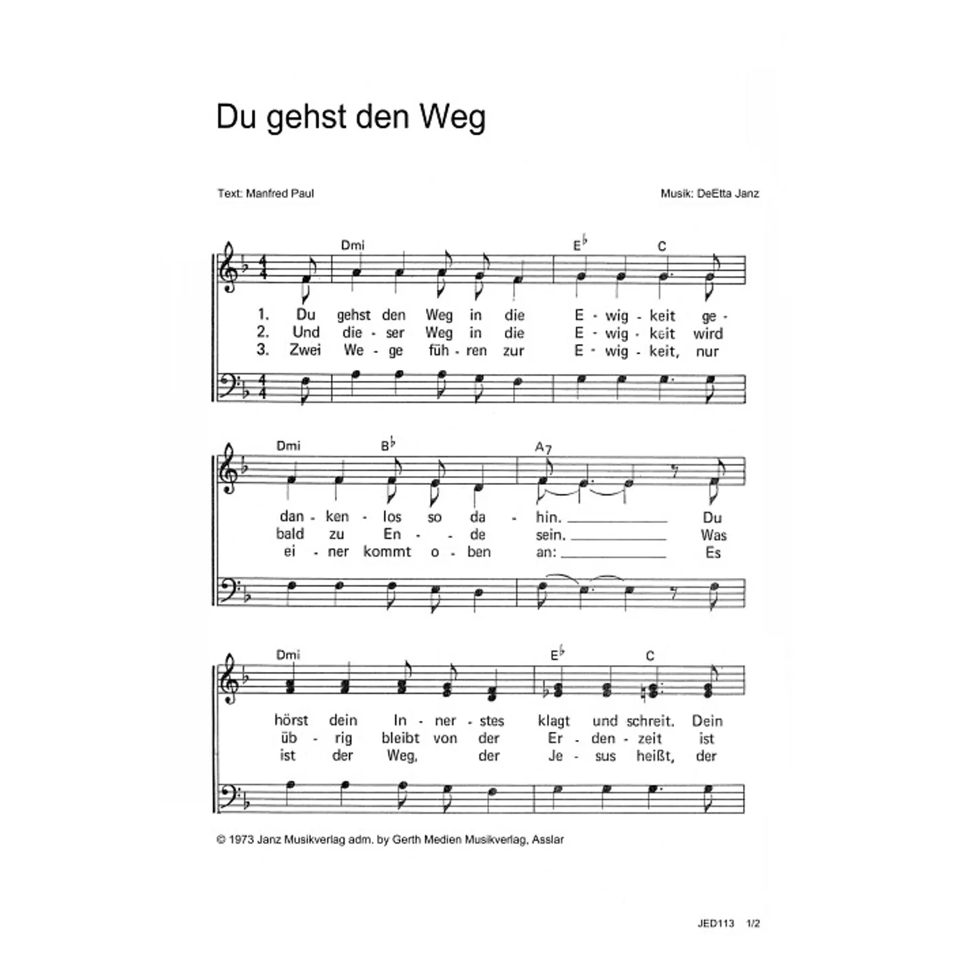 Du gehst den Weg (diese Variante haben Sie gerade ausgewählt) (dreistimmig, gemischter Chor, mit Akkorden, D-Moll) Manfred Paul (Text), DeEtta Janz (Komposition) |