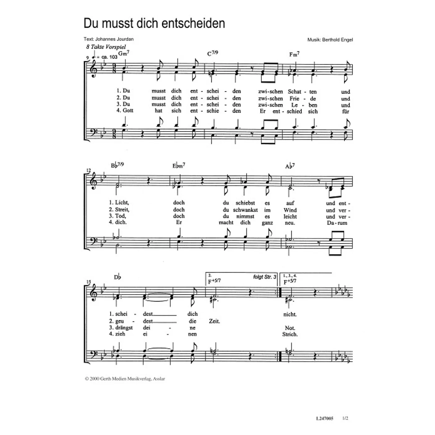 Du musst dich entscheiden (diese Variante haben Sie gerade ausgewählt) (modern, gemischter Chor, mit Akkorden, vierstimmig, G-Moll) Bertold Engel (Komposition), Johannes Jourdan (Text) |