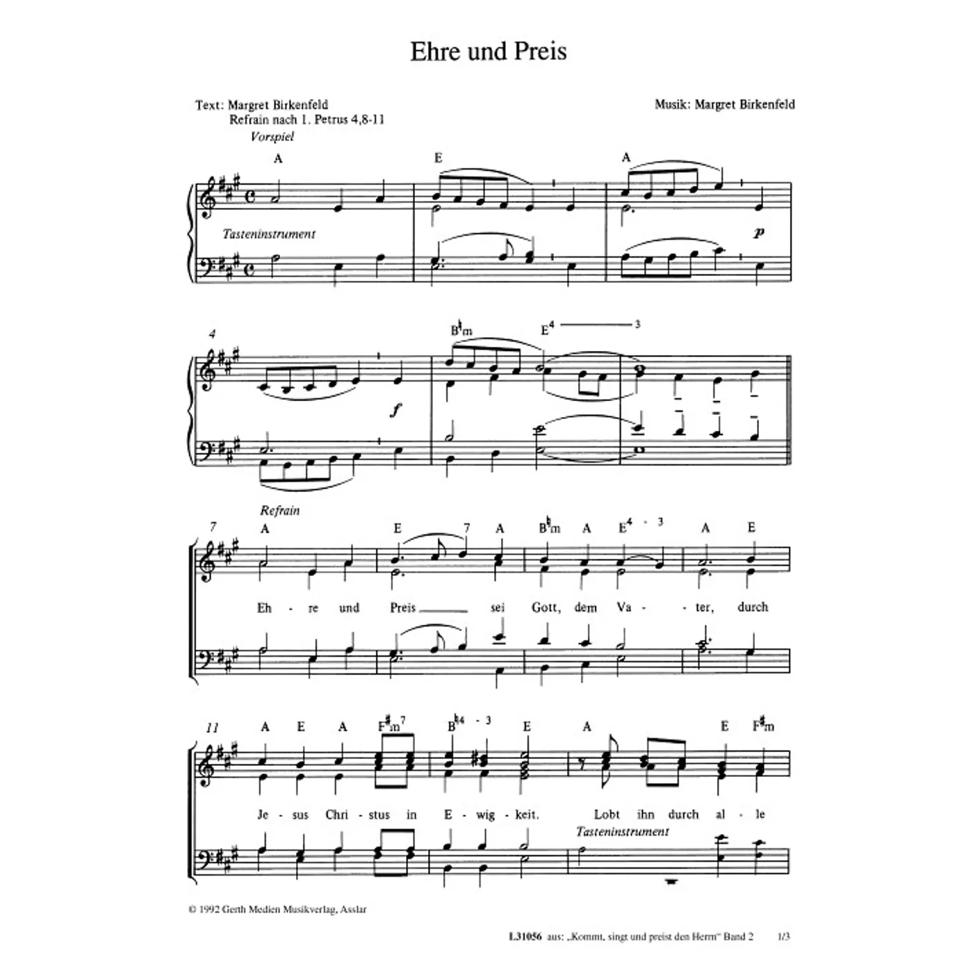 Ehre und Preis (diese Variante haben Sie gerade ausgewählt) (traditionell, Klavier, gemischter Chor, mit Akkorden, vierstimmig, A-Dur) Margret Birkenfeld (Komposition, Text) |