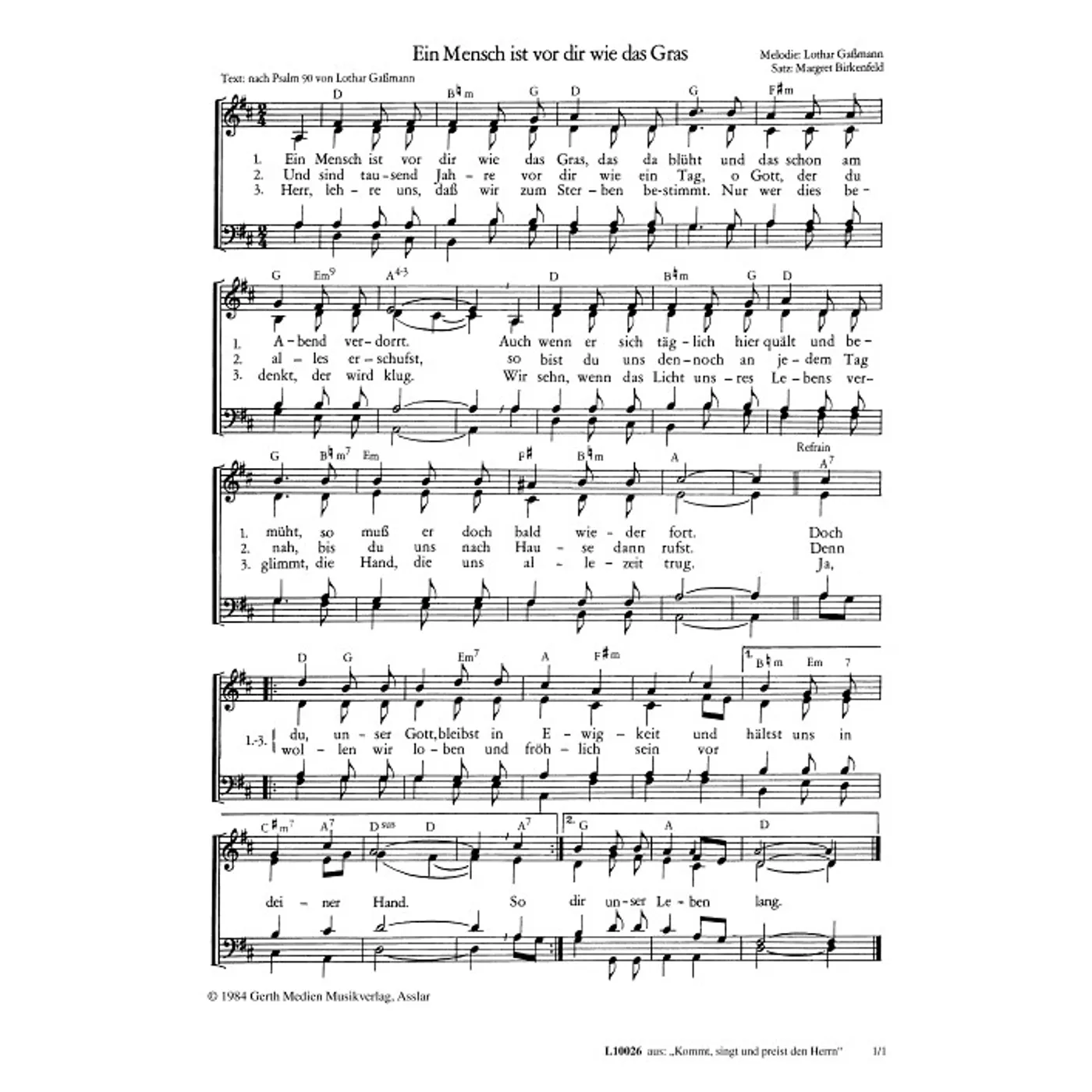 Ein Mensch ist vor dir wie das Gras (diese Variante haben Sie gerade ausgewählt) (traditionell, gemischter Chor, mit Akkorden, vierstimmig, D-Dur) Lothar Gassmann (Komposition, Text), Margret Birkenfeld (Chorsatz) |