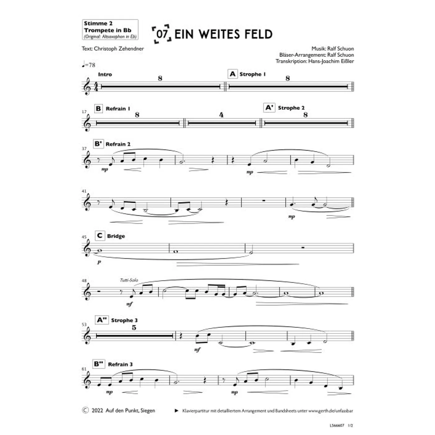 Ein weites Feld (2. Trompete in Bb) (diese Variante haben Sie gerade ausgewählt) (Gemeindelied, Bläser, Orchestereinzelstimme, B-Dur) Christoph Zehendner (Text), Hans-Joachim Eißler (Bläsersatz), Ralf Schuon (Komposition, Bläsersatz) |