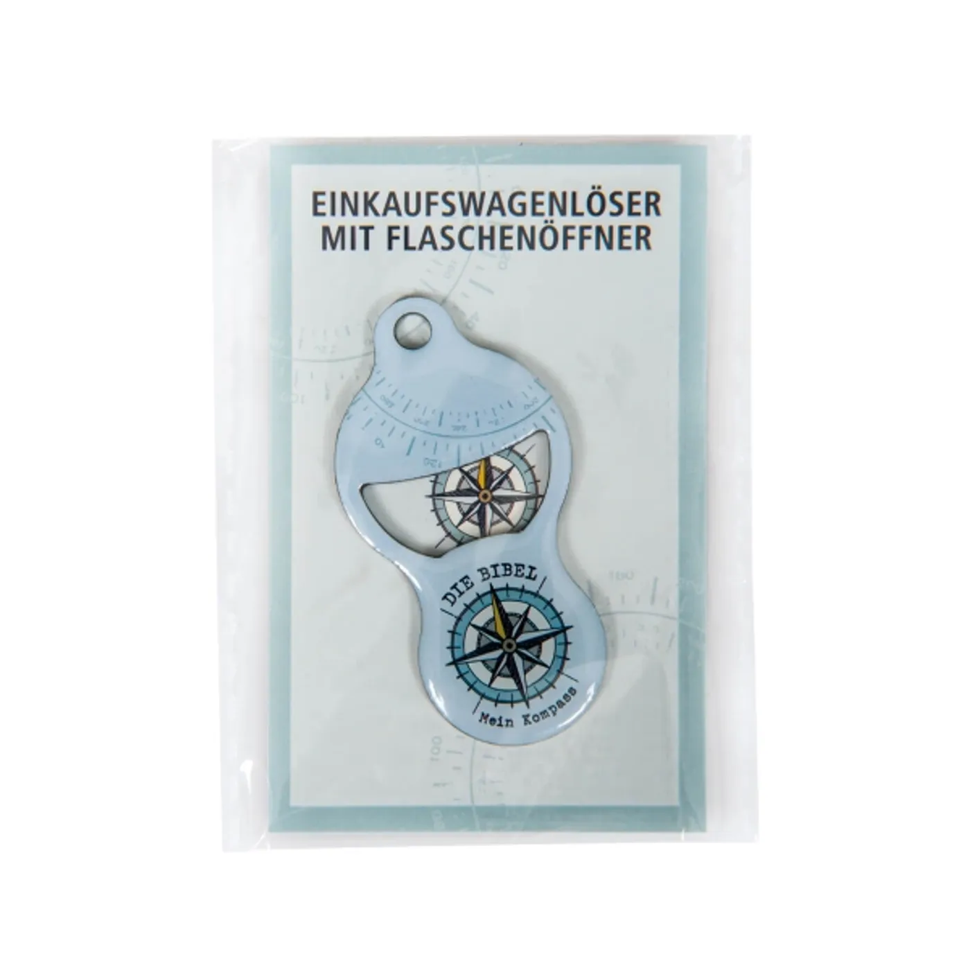 Der Einkaufswagenlöser mit Motiv Kompass hängt am Schlüsselbund, entriegelt den Einkaufswagen und erspart umständliches Hantieren bei der Wagen-Rückgabe.