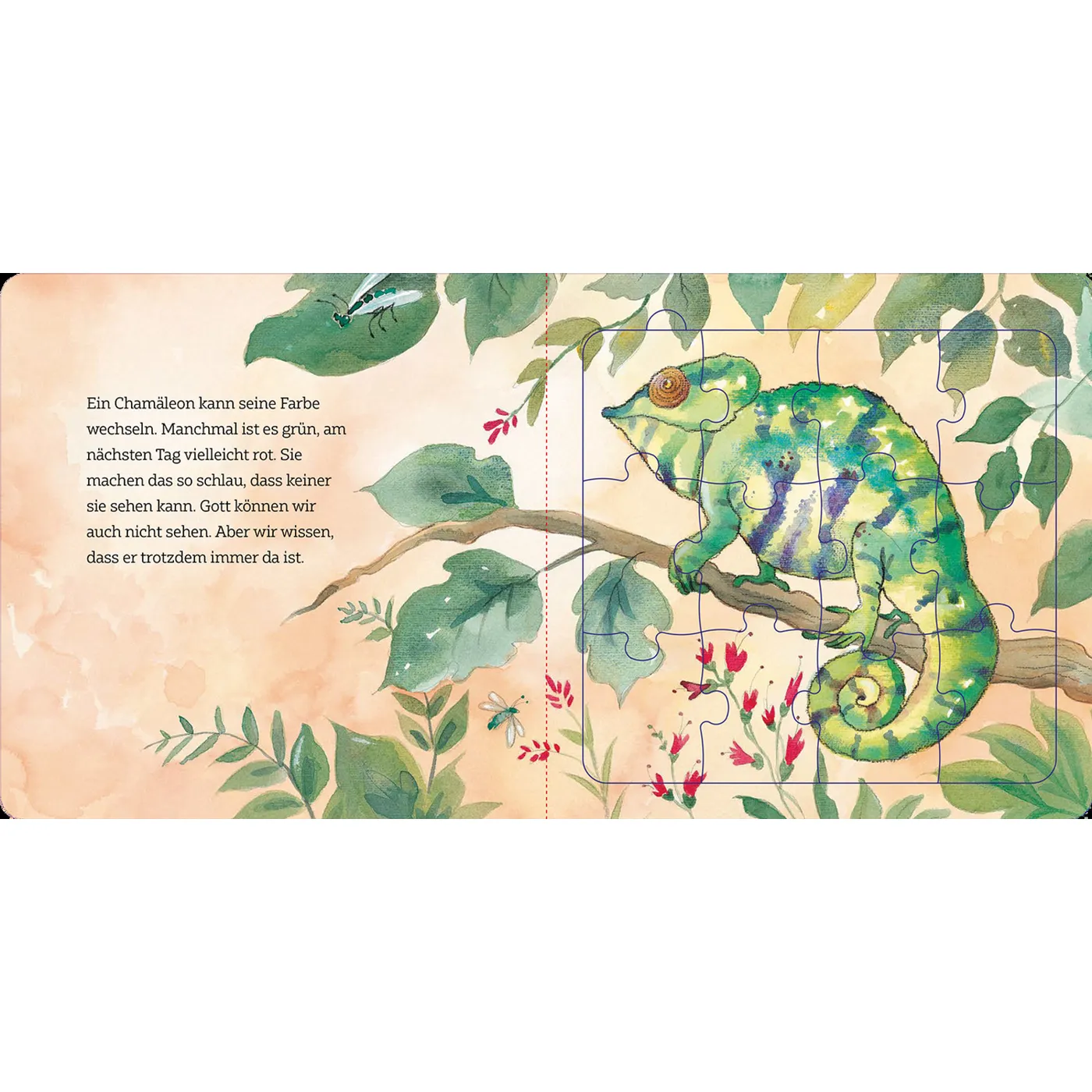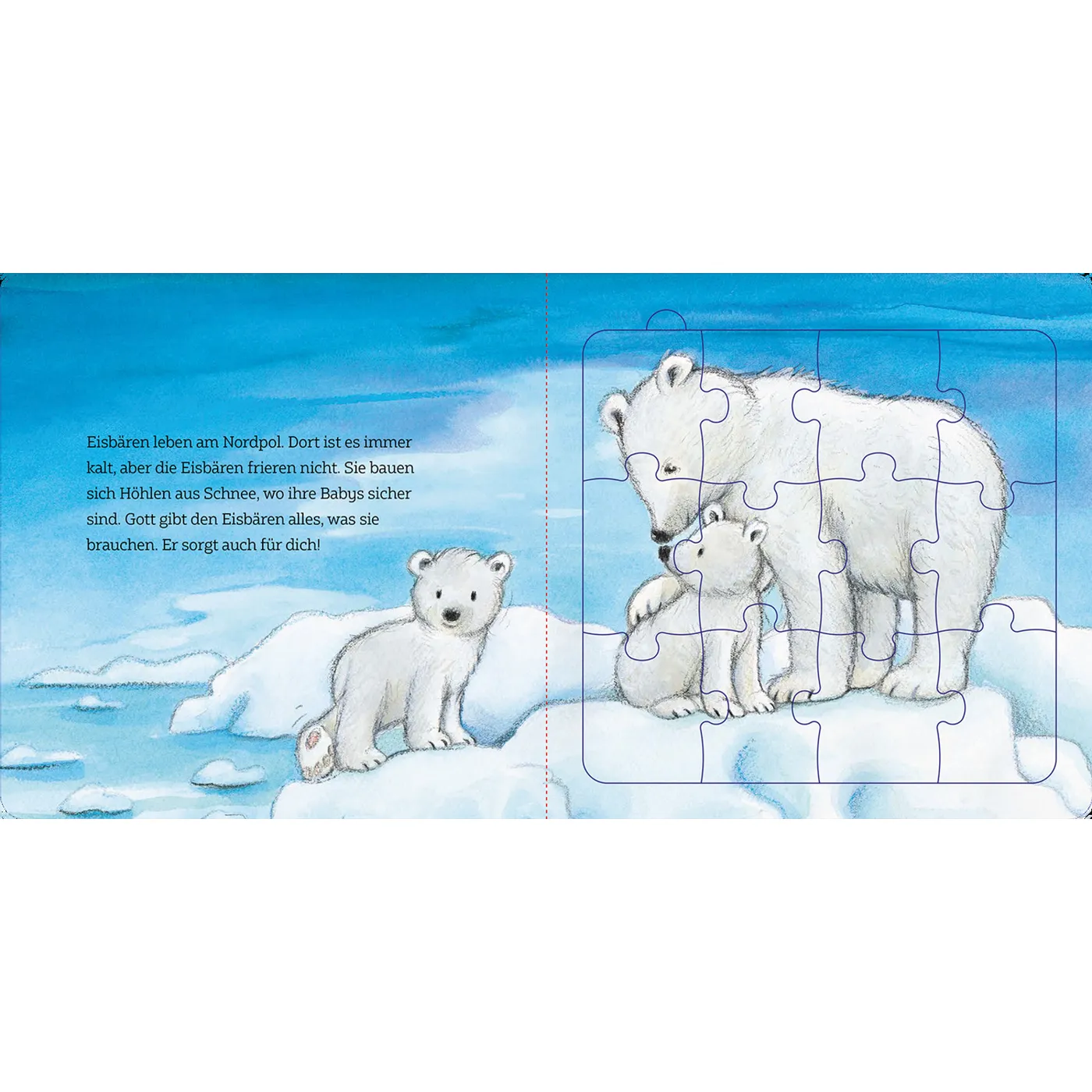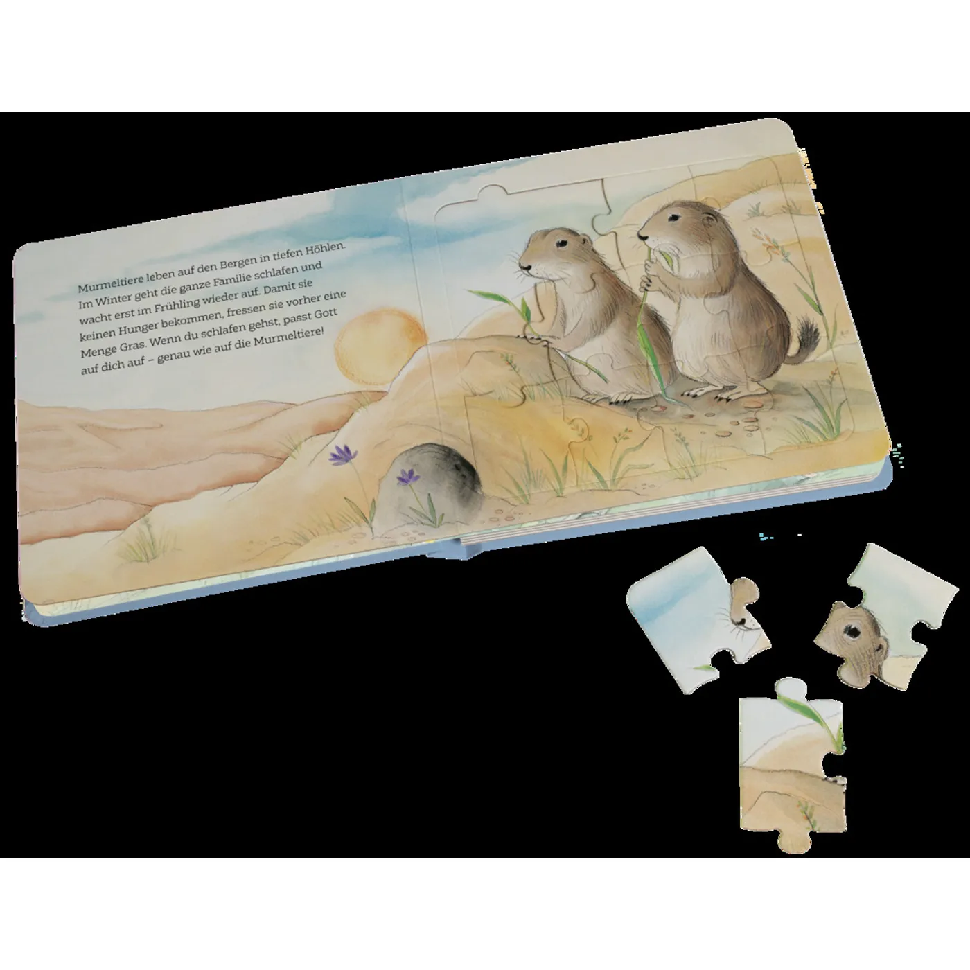Insgesamt 6 unterschiedliche Tiere werden im Innenteil auf je einer Doppelseite vorgestellt: Murmeltier, Fuchs, Chamäleon, Känguru, Faultier und Eisbär. Eine sich über beide Seiten erstreckende, detailreiche Zeichnung zeigt das Tier in seinem jeweiligen Lebensraum. Auf der linken Seite ist jeweils ein kurzer, begleitender Text abgedruckt. In ein bis zwei Sätzen wird etwas über das Tier erzählt; sodann folgt eine Übertragung auf den christlichen Glauben (bspw. 'Im warmen Beutel am Bauch der Mutter ist das Baby ganz nah bei ihr. Wenn wir ganz nah bei Gott sind, geht es uns gut.' - Känguru). Die rechte Seite ist als Puzzle gestaltet mit insgesamt 12 Teilen. Hier können die Kinder das vorgestellte Tier puzzeln. Die Puzzleteile weisen dabei eine angenehme Dicke vor und wirken stabil genug für Kinderhände.