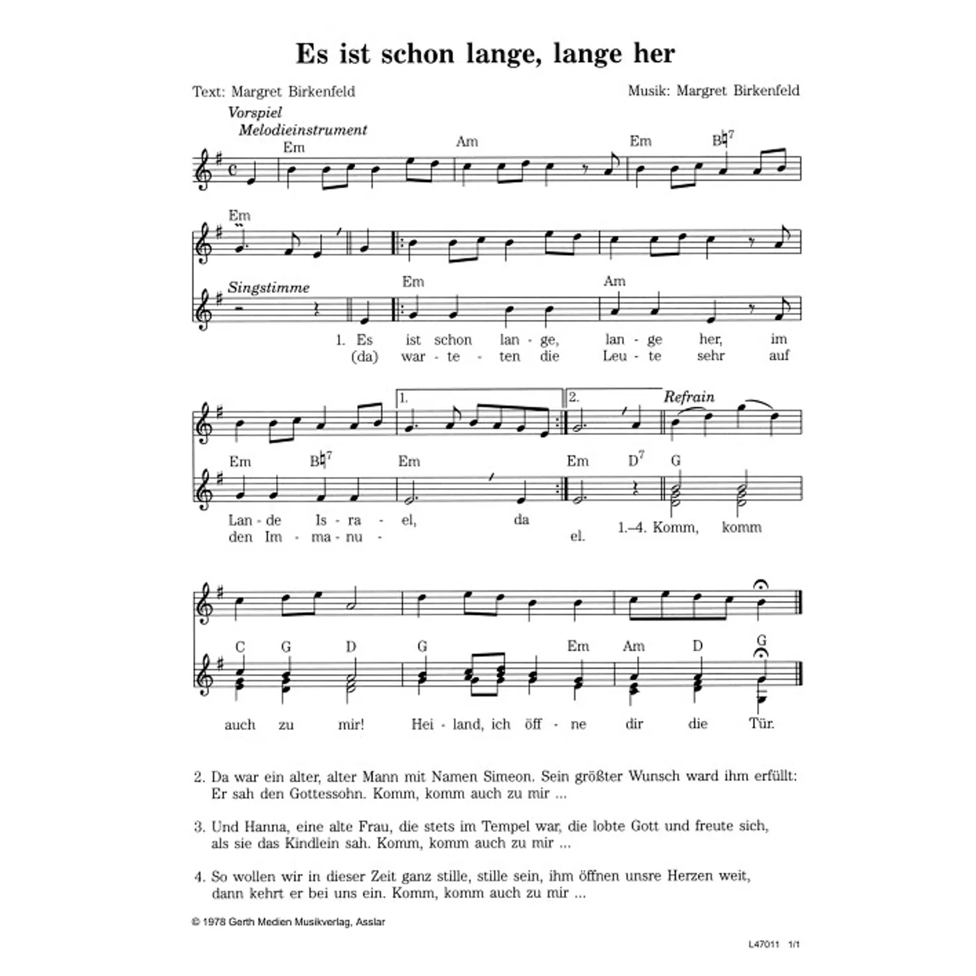 Es ist schon lange, lange her (diese Variante haben Sie gerade ausgewählt) (Kinderchor, dreistimmig, mit Akkorden, E-Moll) Margret Birkenfeld (Komposition, Text, Chorsatz) |