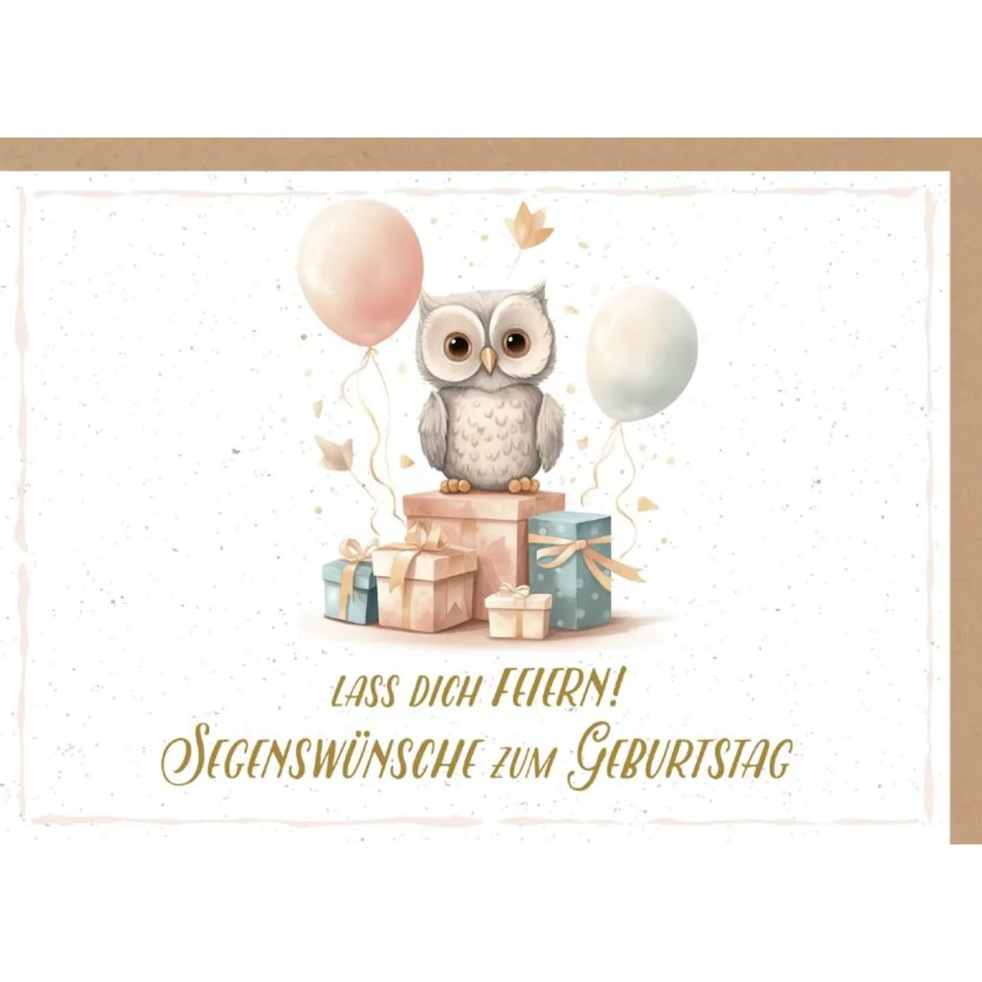 Freudige Doppelkarte zum Geburtstag mit einem niedlichen Eulen-Motiv. Das besondere an dieser Karte aus unserer neuen Kollektion "Herzensfreude" ist, dass der Schriftzug in goldveredelter Schrift ist. Einfach schön, um Segenswünsche zu verschicken und Freude zu bereiten.