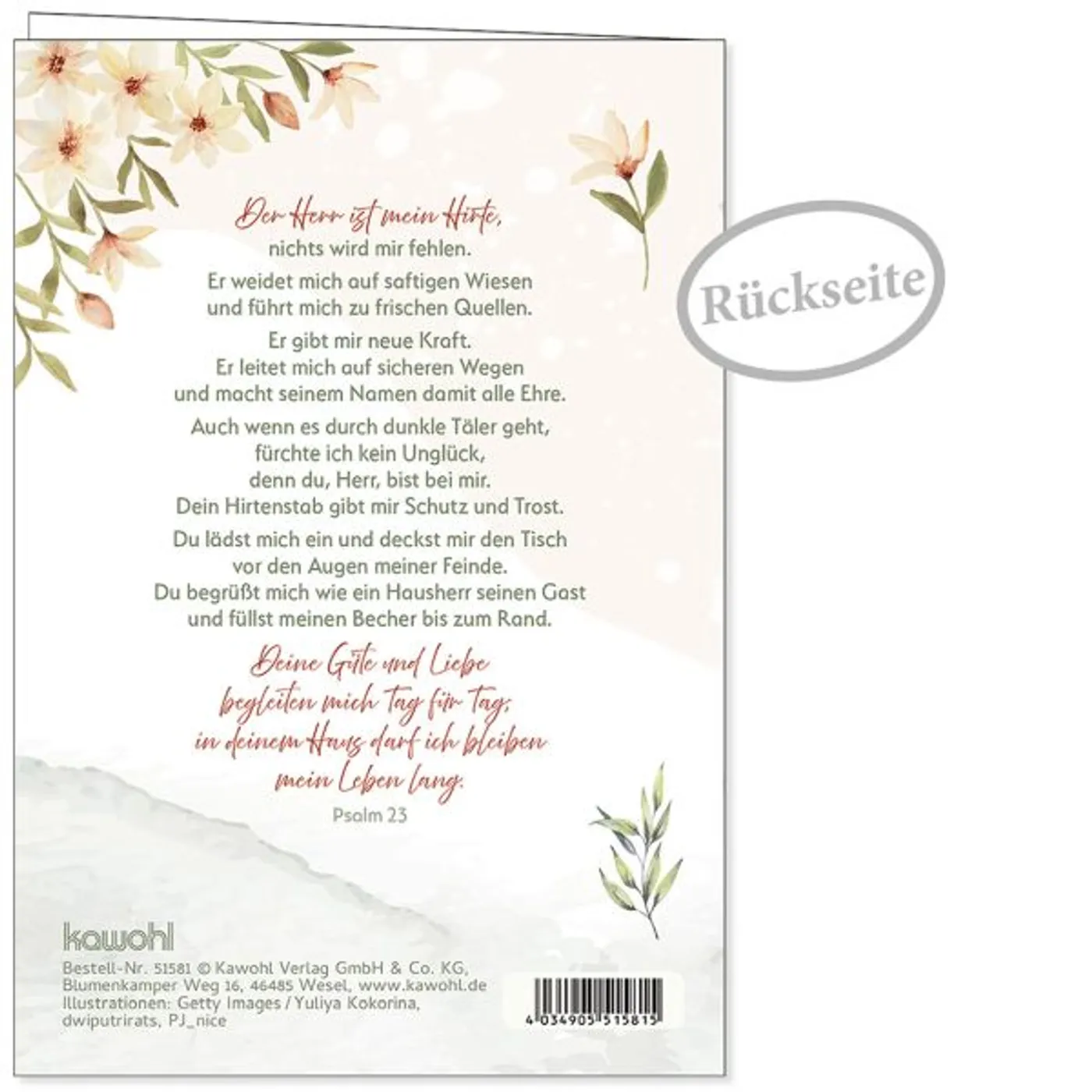 Der HERR ist mein Hirte, nichts wird mir fehlen. Er weidet mich auf saftigen Wiesen und führt mich zu frischen Quellen. Er gibt mir neue Kraft. Er leitet mich auf sicheren Wegen und macht seinem Namen damit alle Ehre. Auch wenn es durch dunkle Täler geht, fürchte ich kein Unglück, denn du, HERR, bist bei mir. Dein Hirtenstab gibt mir Schutz und Trost. Du lädst mich ein und deckst mir den Tisch vor den Augen meiner Feinde. Du begrüßt mich wie ein Hausherr seinen Gast und füllst meinen Becher bis zum Rand. Deine Güte und Liebe begleiten mich Tag für Tag; in deinem Haus darf ich bleiben mein Leben lang. Psalm 23