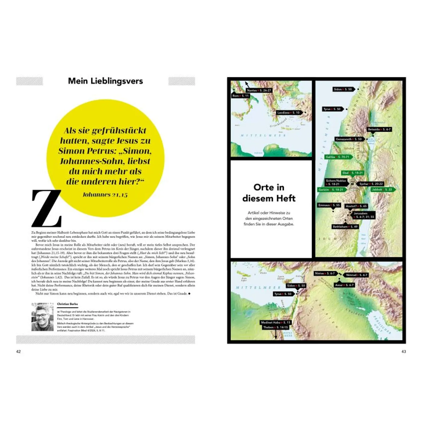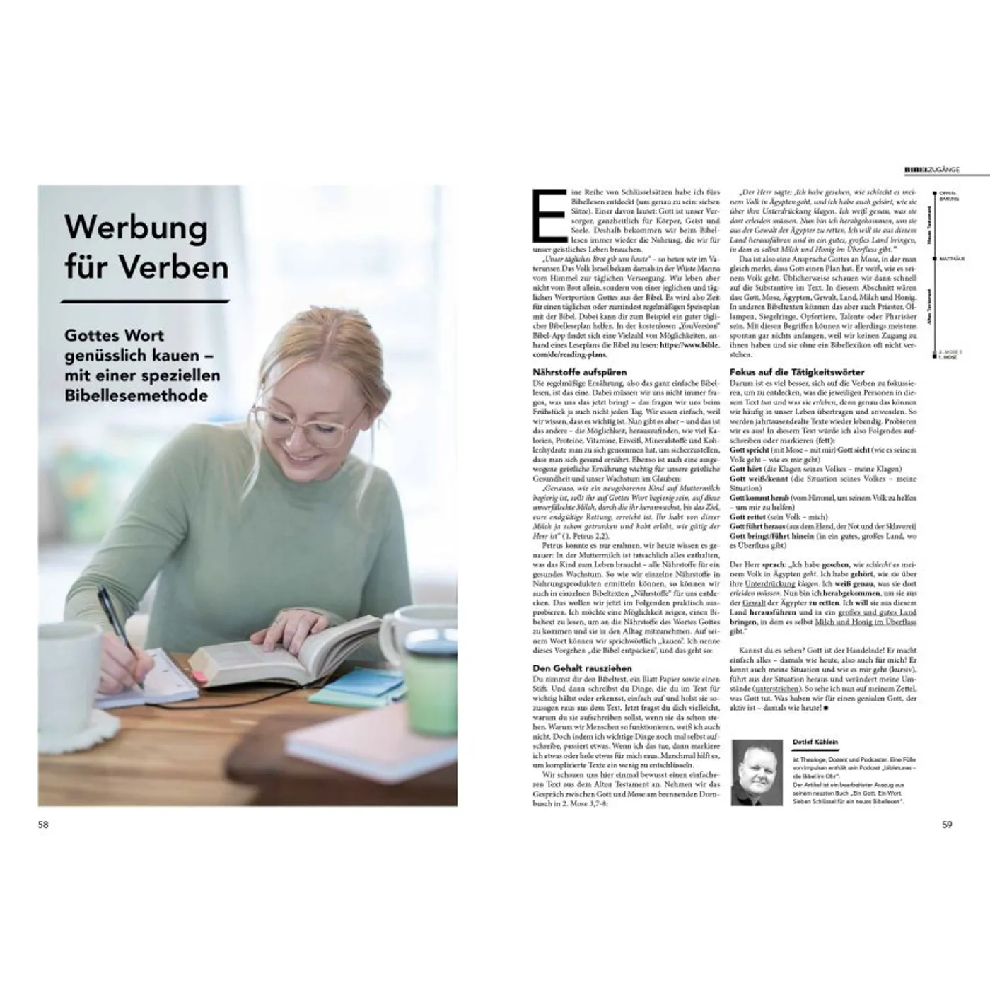 Faszination Bibel will dabei helfen, die Bibel mehr und tiefer zu verstehen. Jede Ausgabe lädt dazu ein, ihre Kraft zu erfahren und ihre Relevanz für das eigene Leben zu erfassen. Der Mix aus faszinierenden Hintergrundwissen und persönlichen Erfahrungsberichten verschafft dem Leser mit jedem Heft neue Aha-Erlebnisse. Faszination Bibel will dazu ermutigen, in der Stillen Zeit Neues auszuprobieren und so den individuellen Zugang zur Bibel (neu) zu entdecken. Faszination Bibel ist ein Magazin mit bleibendem Nutzwert – zum immer wieder aufschlagen und nachlesen. Zusätzlich zu den vier regulären Ausgaben erhalten die Leser im Abonnement jährlich ein hochwertiges monothematisches Sonderheft. Die Faszination Bibel-Themen: BibelWissen: Der Bibel vertrauen und ihre wegweisende Wahrheit erkennen. Das gelingt am besten mit fundierten Hintergründen und erstaunlichen Erkenntnissen aus Archäologie und Bibelwissenschaften. So eröffnet sich ein ganz neuer Blick auf Bekanntes. BibelErfahrung: Die Bibel ist das lebendige Wort Gottes. Es wirkt und trägt, bietet Weisheit und Lebensperspektiven, die wirklich halten. Das erfahren Menschen immer wieder und werden so zur Inspiration für den eigenen Alltag mit Gott. BibelZugänge: Im überfüllten Alltag erscheint der eigene Zugang zur Bibel oft versperrt. Bibelmüdigkeit macht sich breit, und es gibt eine große Sehnsucht nach Gottes heilsamer Botschaft. „BibelZugänge“ bietet verschiedene Blickwinkel auf eine zentrale biblische Aussage. Eine Einladung zur persönlichen stillen Zeit, die Lust macht, die Stellen in der Bibel nachzulesen.