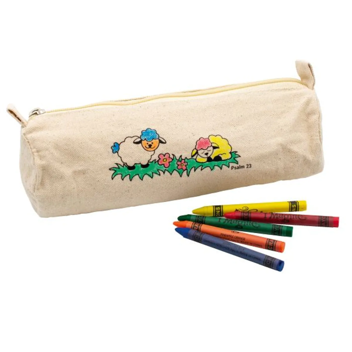 Bedruckt ist das Mäppchen mit zwei niedlichen Schäfchen und dem Vers „Psalm 23“. Das süße Motiv kann nach Belieben ausgemalt werden und macht damit jedes Mäppchen zu einem individuellen Unikat.