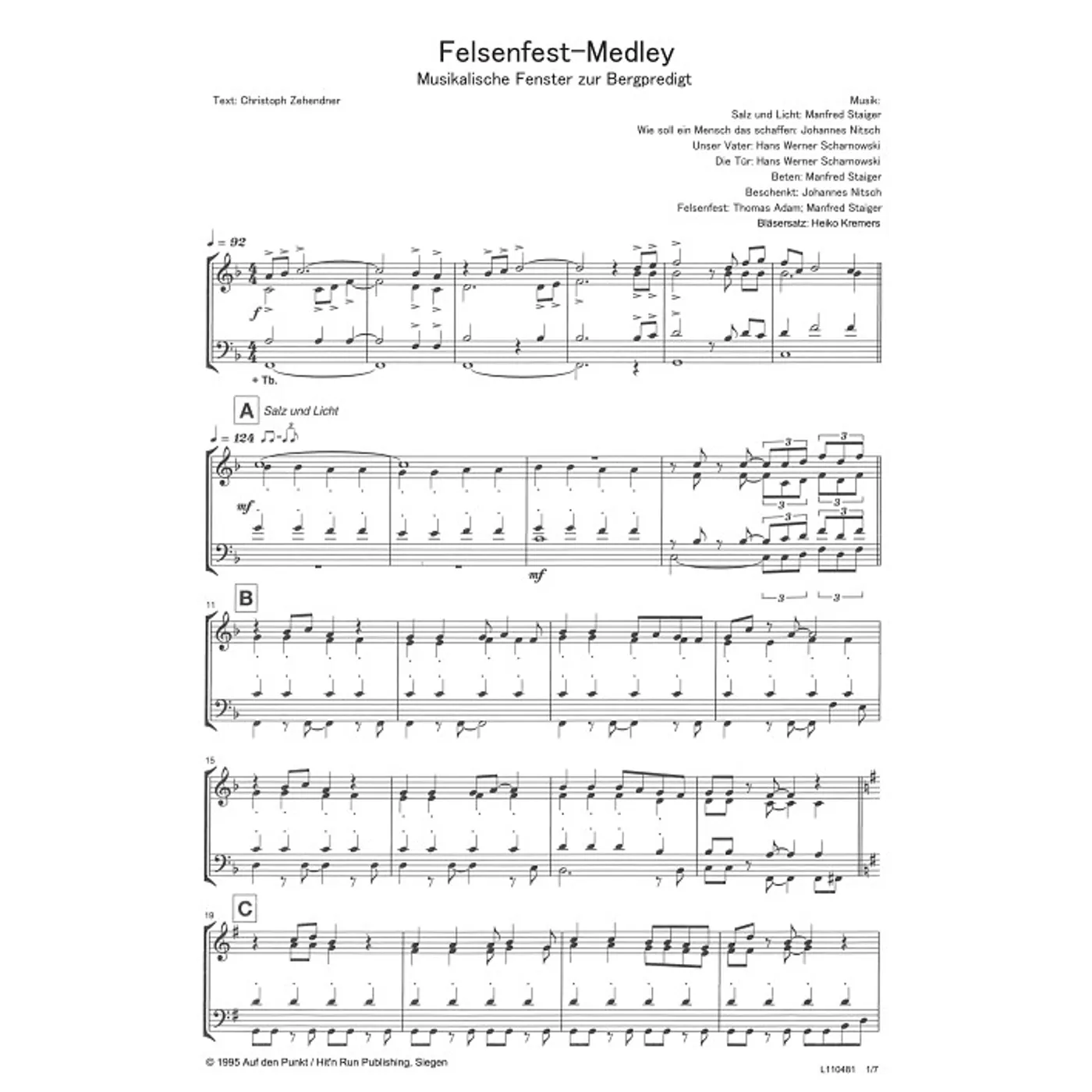 Felsenfest-Medley (diese Variante haben Sie gerade ausgewählt) (modern, Bläser, Bläserpartitur, Partituren, vierstimmig) Thomas Adam (Komposition), Johannes Nitsch (Komposition), Hans Werner Scharnowski (Komposition), Manfred Staiger (Komposition), Christoph Zehendner (Text), ... |
