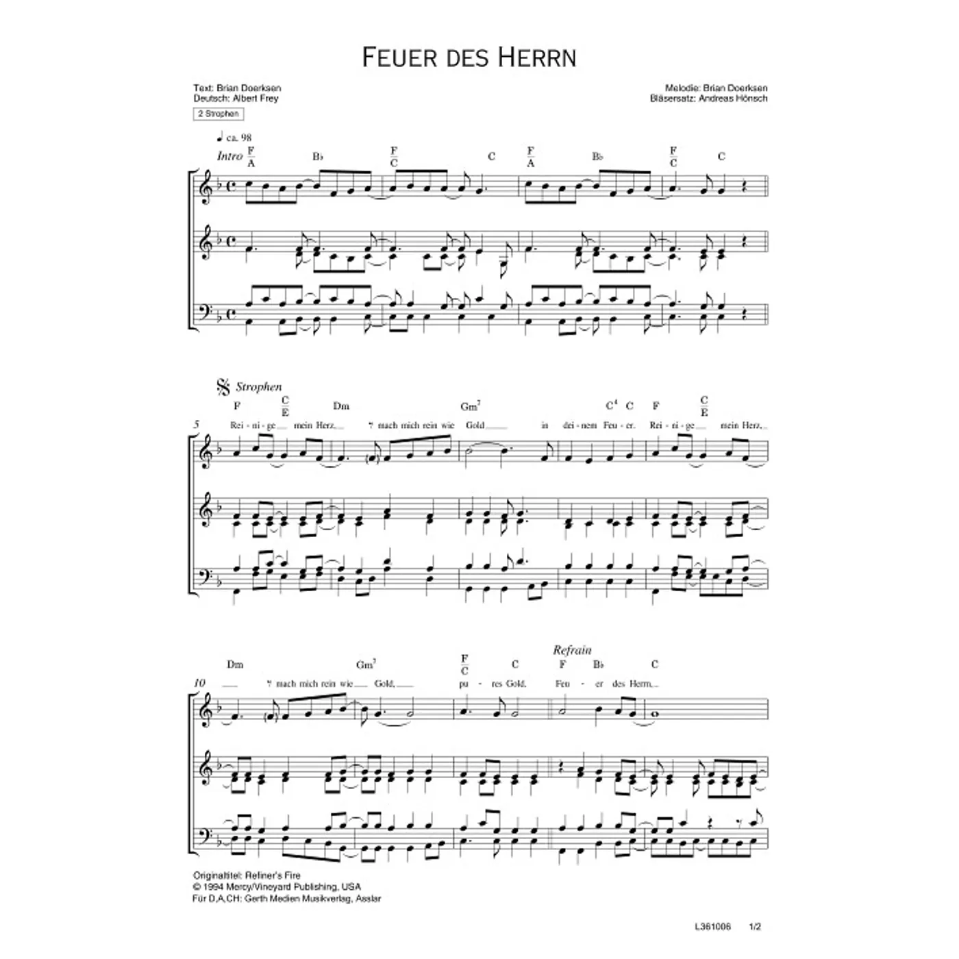 Feuer des Herrn (diese Variante haben Sie gerade ausgewählt) (Bläser, Bläserpartitur, Partituren, mit Akkorden, F-Dur) Brian Doerksen (Komposition, Text), Andreas Hönsch (Bläsersatz), Albert Frey |